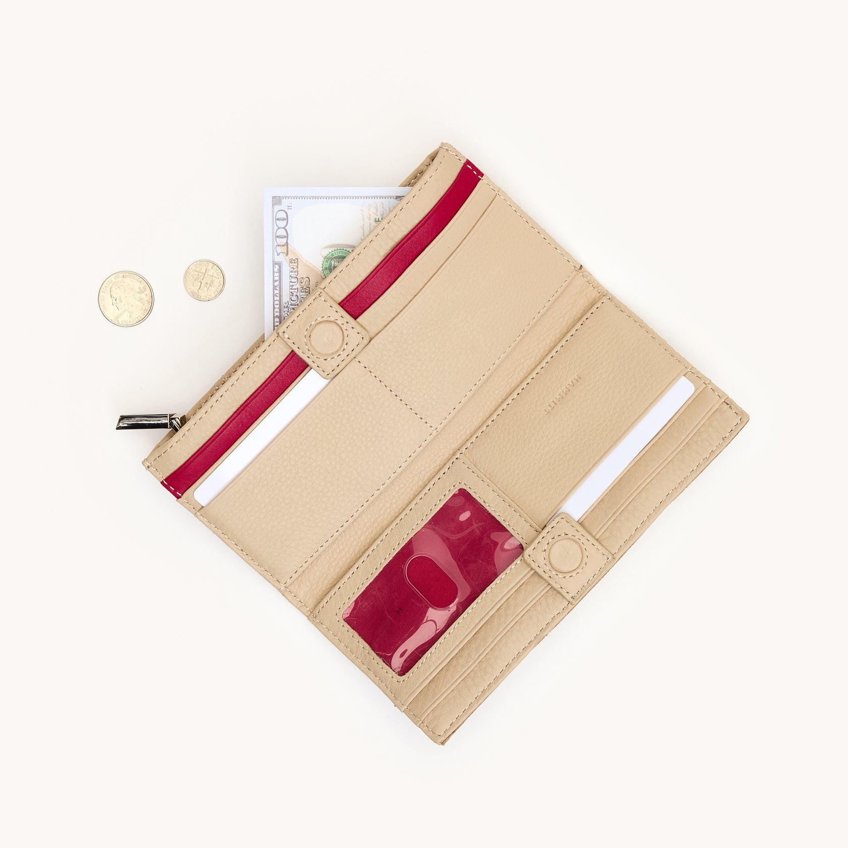 • Interior: ten credit card slots, one transparent ID slot, two currency drop pockets