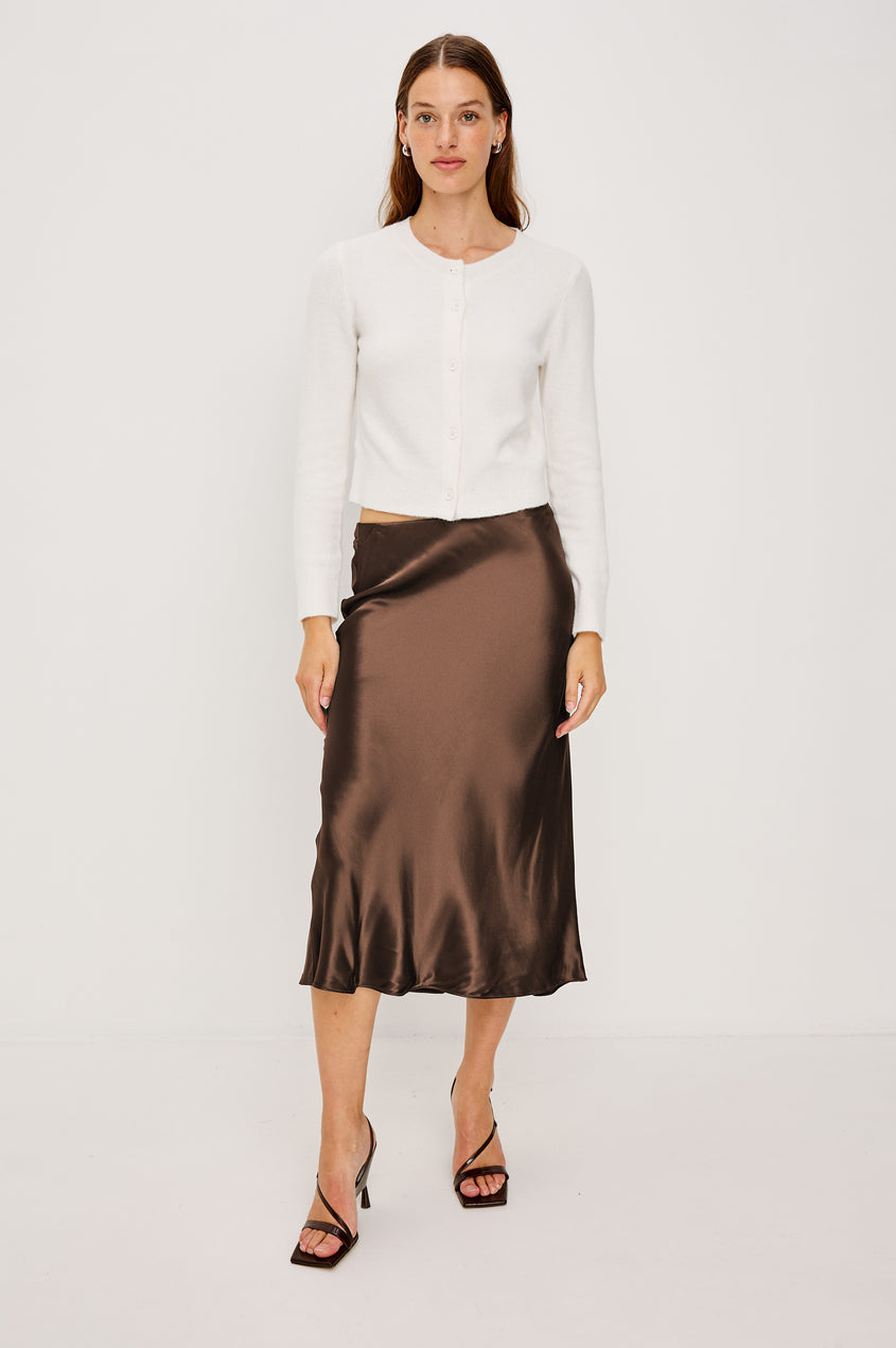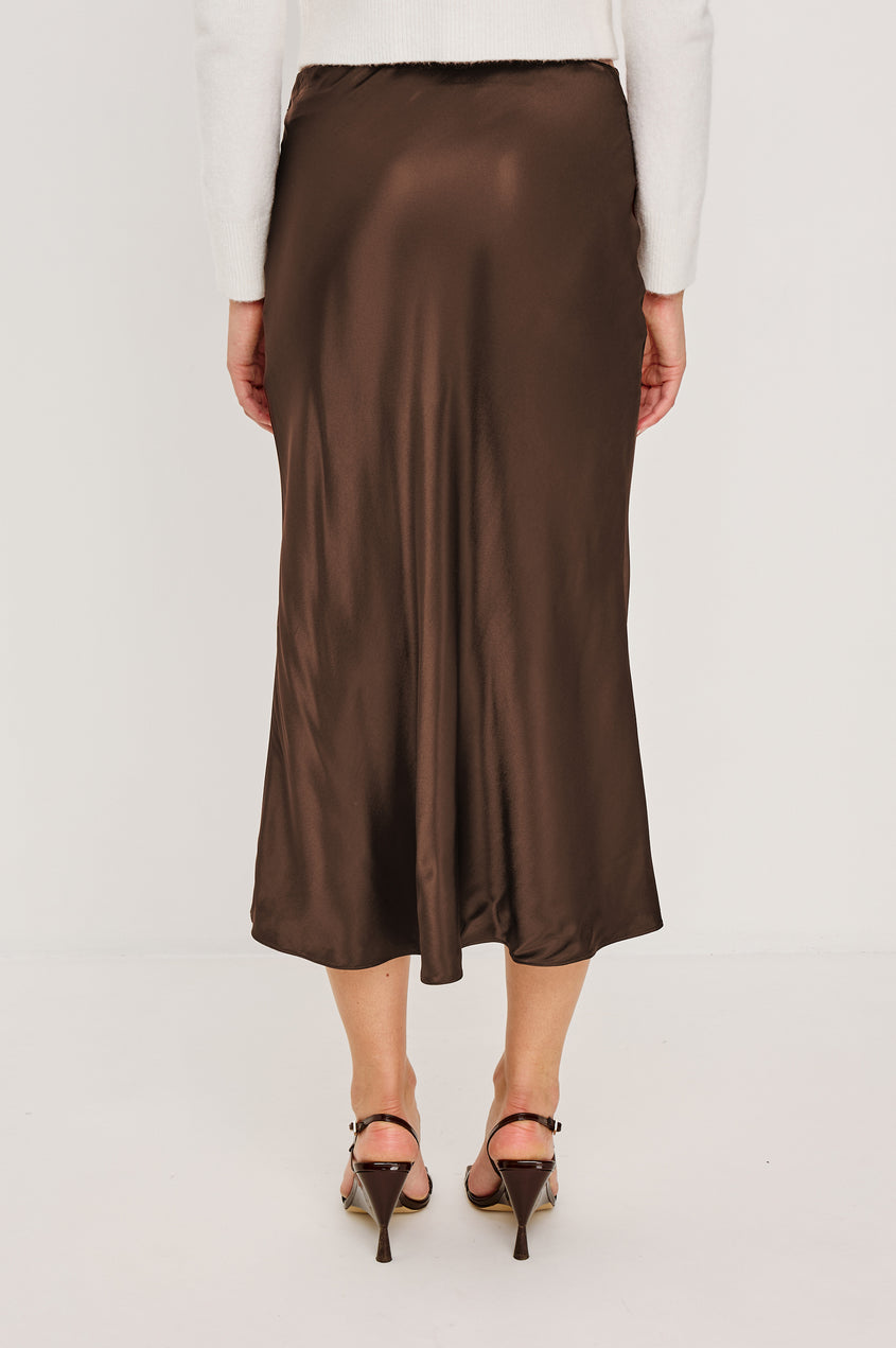 The Anya is a midi-length skirt crafted from satin crepe with a concealed elastic waistband. Designed to sit high at the waist with a pull-on style, it delivers an easy, polished look perfect for both everyday wear and special occasions.