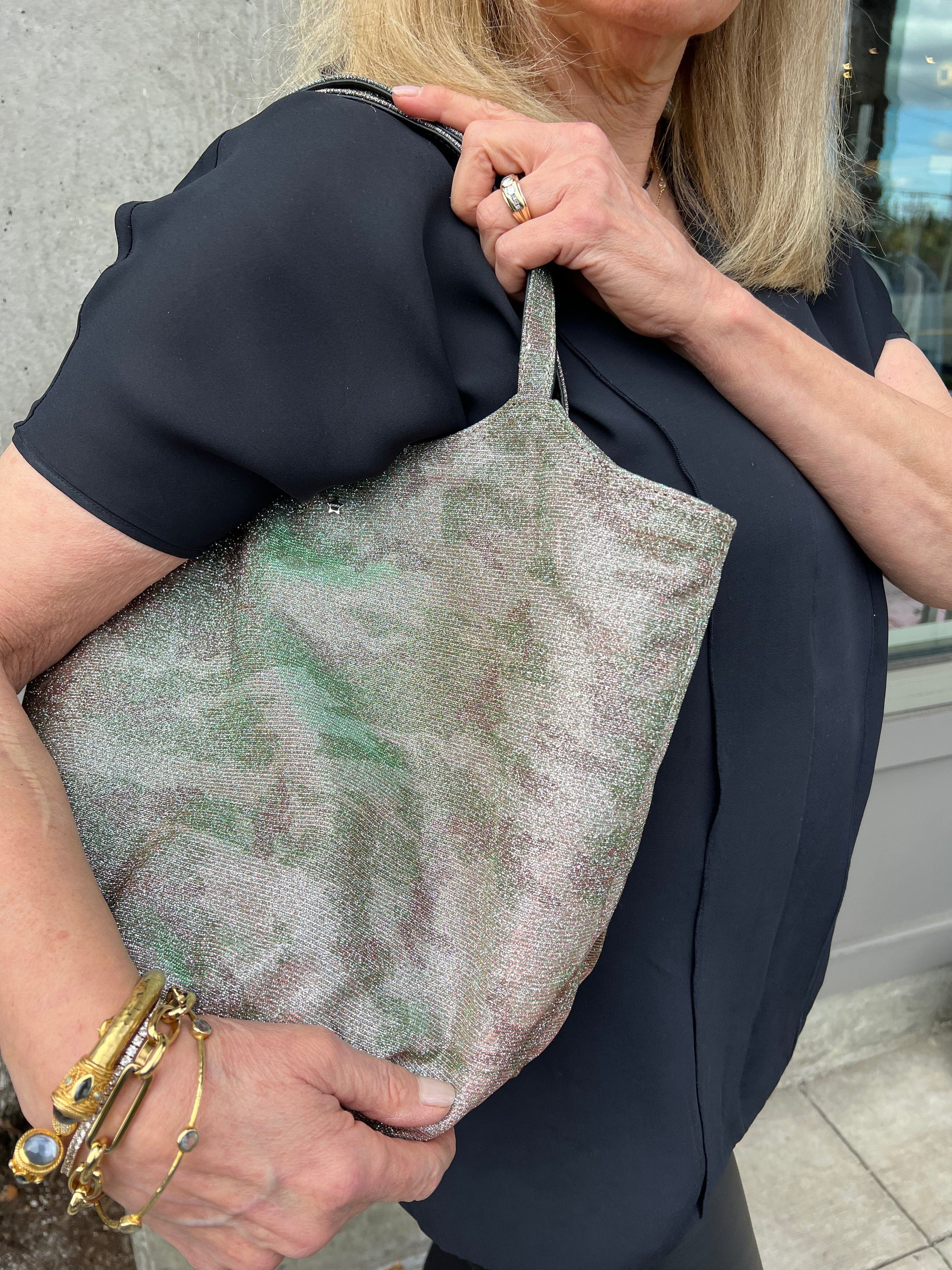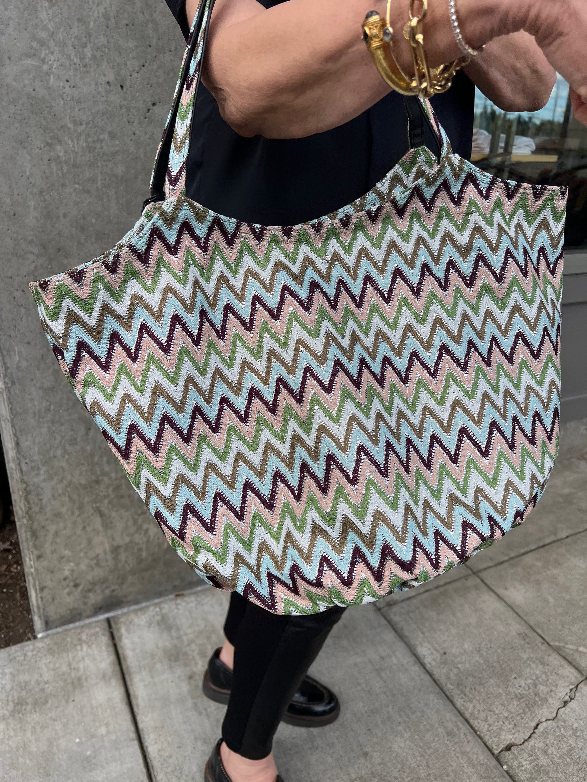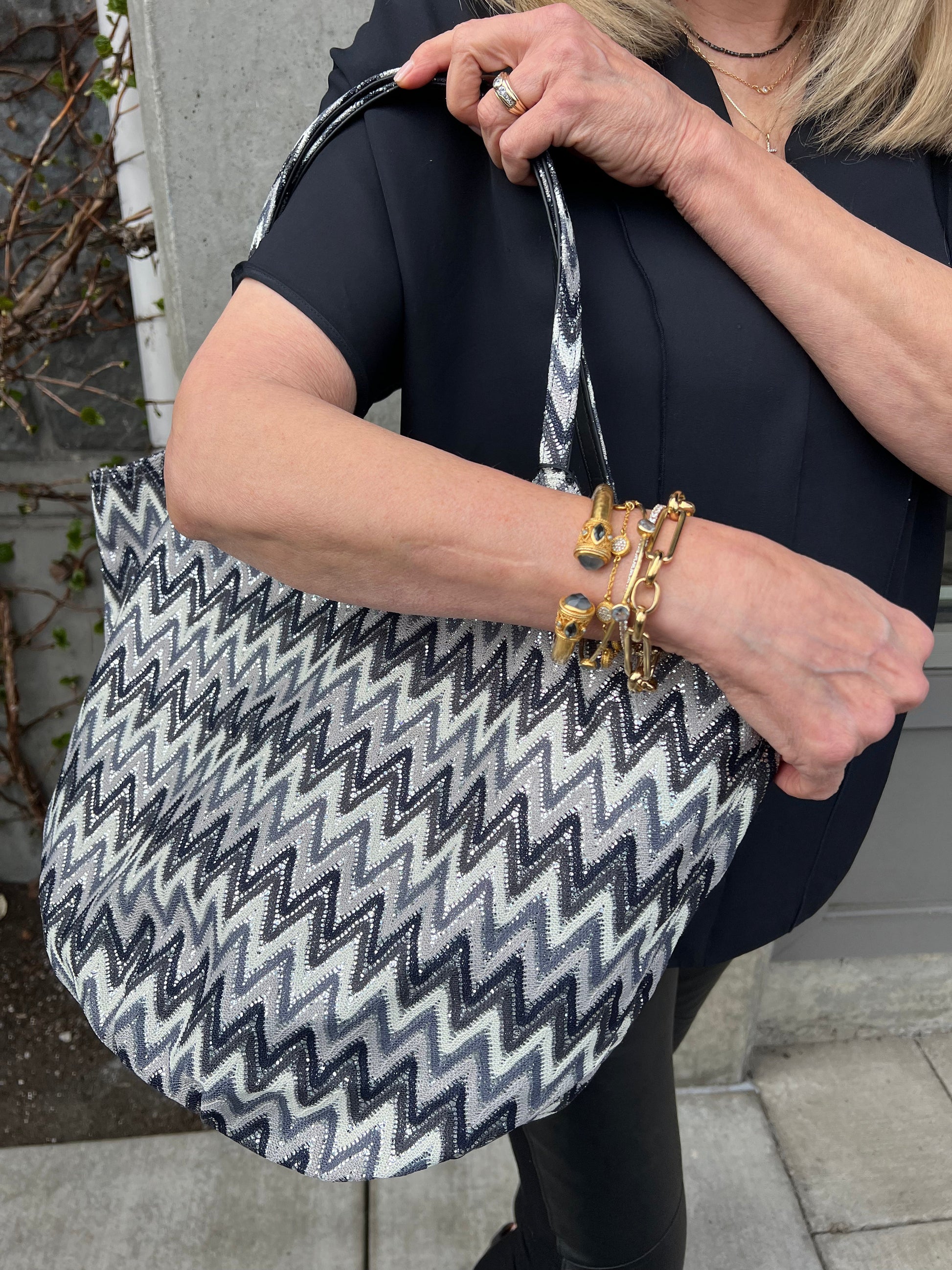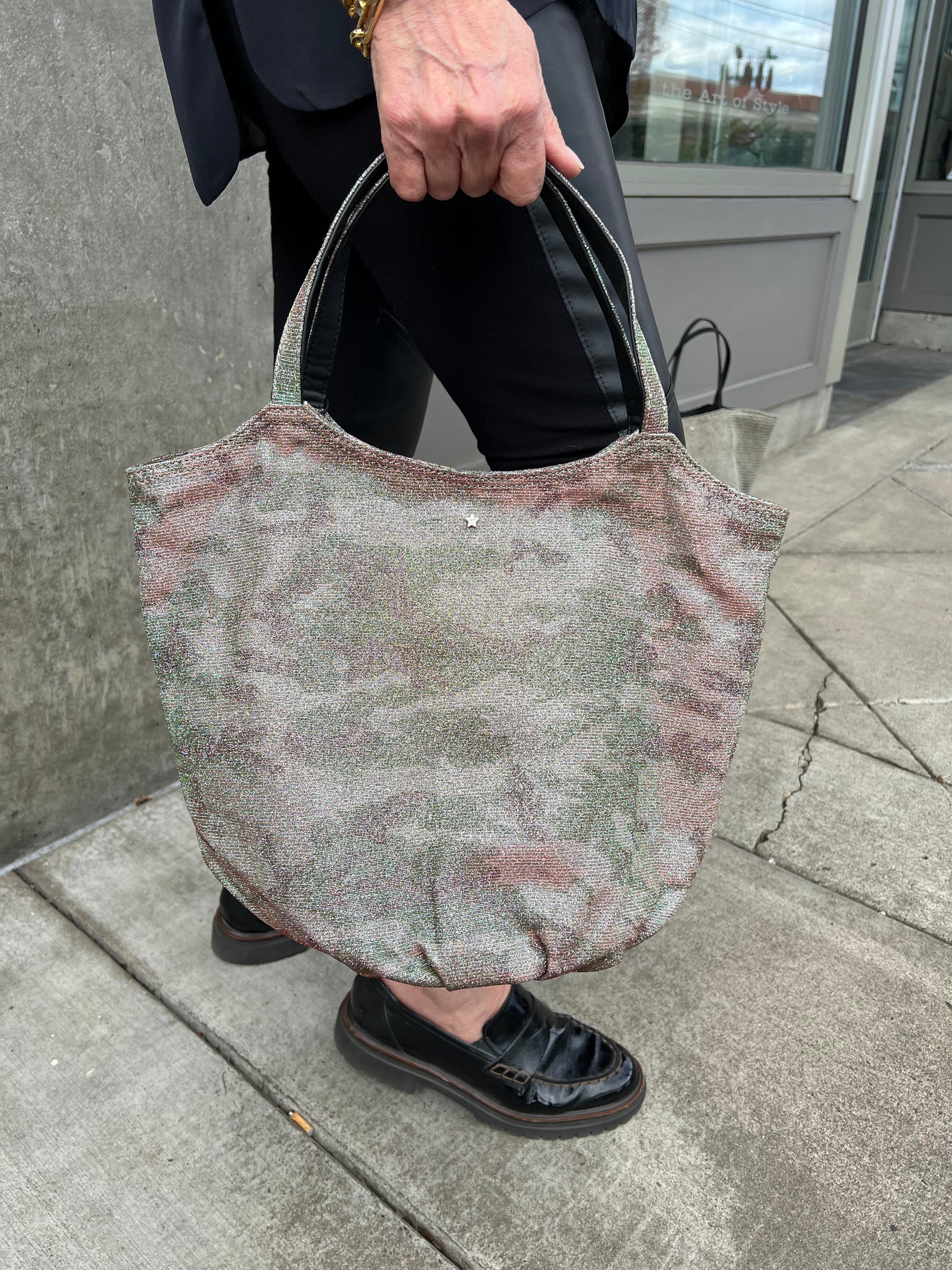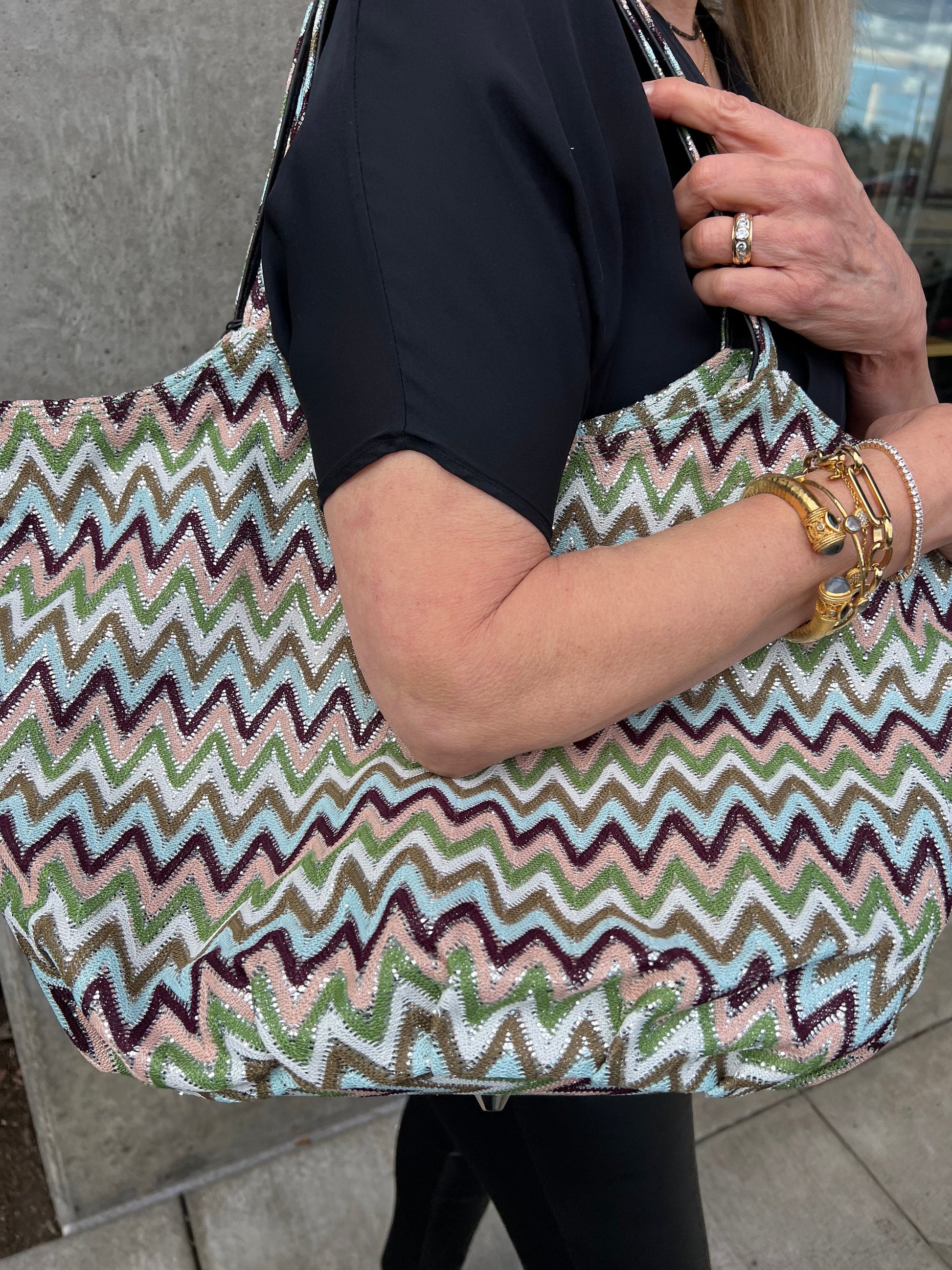 The Armando Extra Tote is an oversized bag designed for everyday essentials or travel. It makes a bold statement with its eye-catching chevron or camo glittery patterns, available in three versatile color options. With sturdy handles for comfortable carrying and a roomy interior, this tote blends style with practicality.
