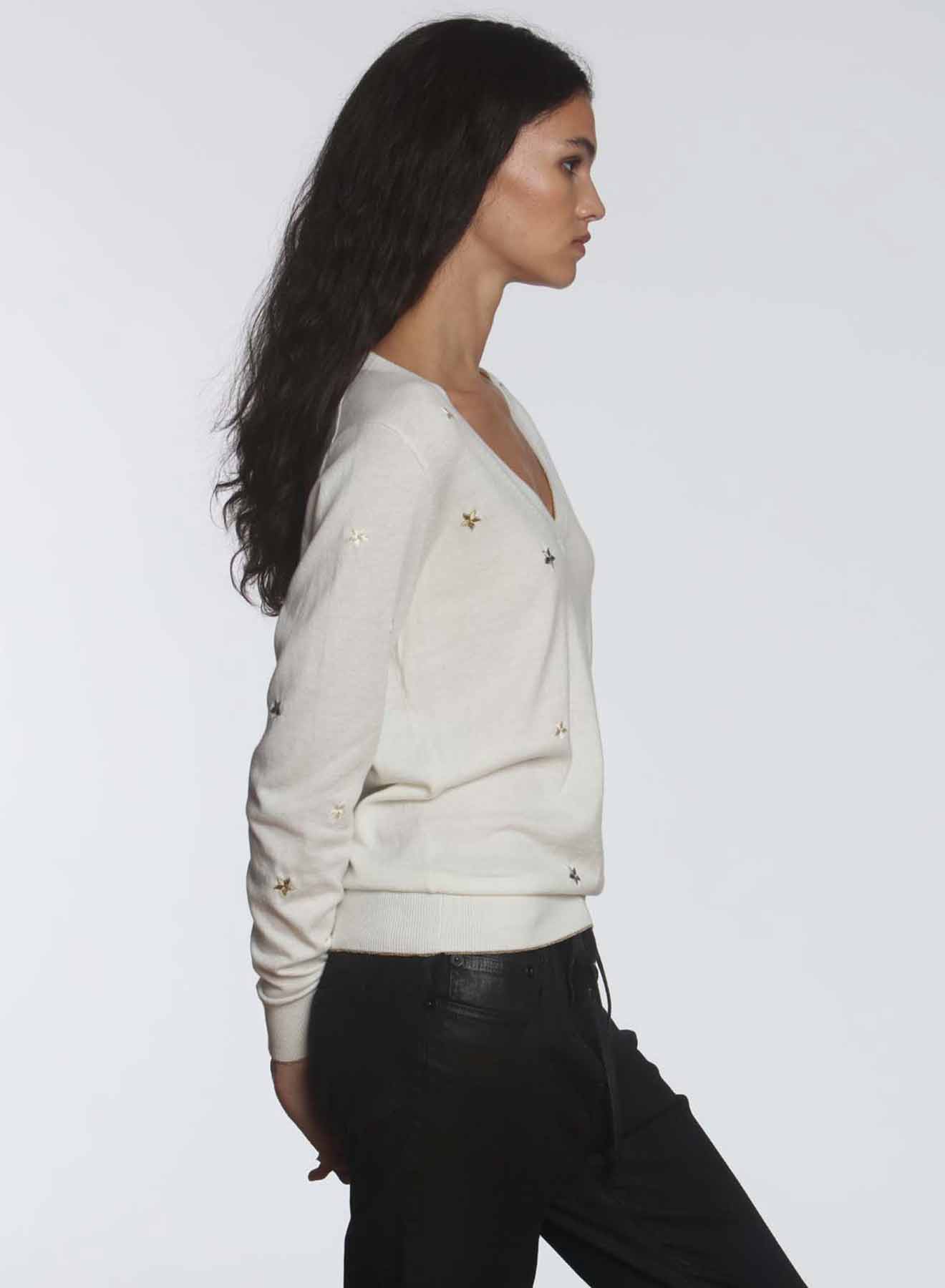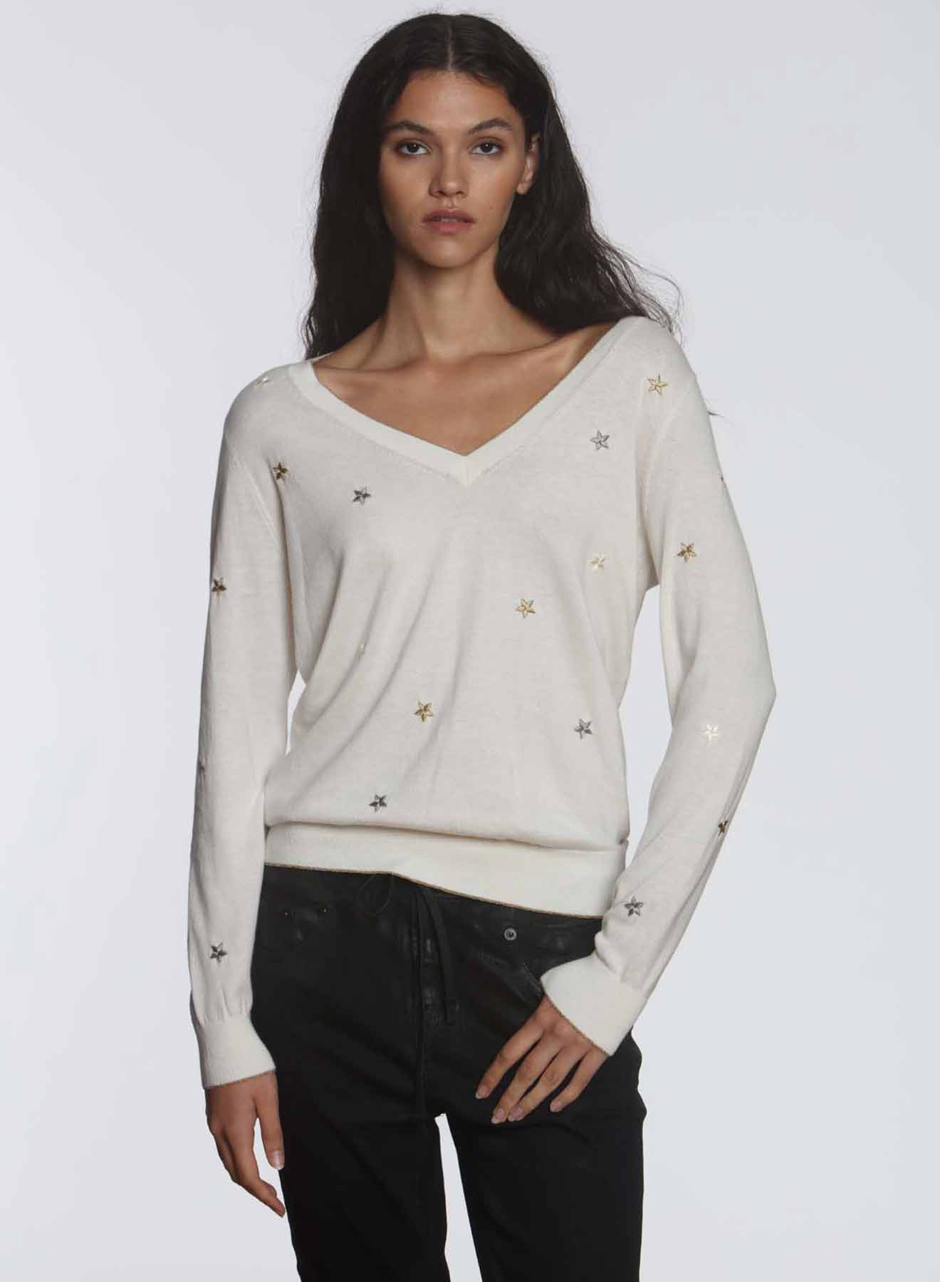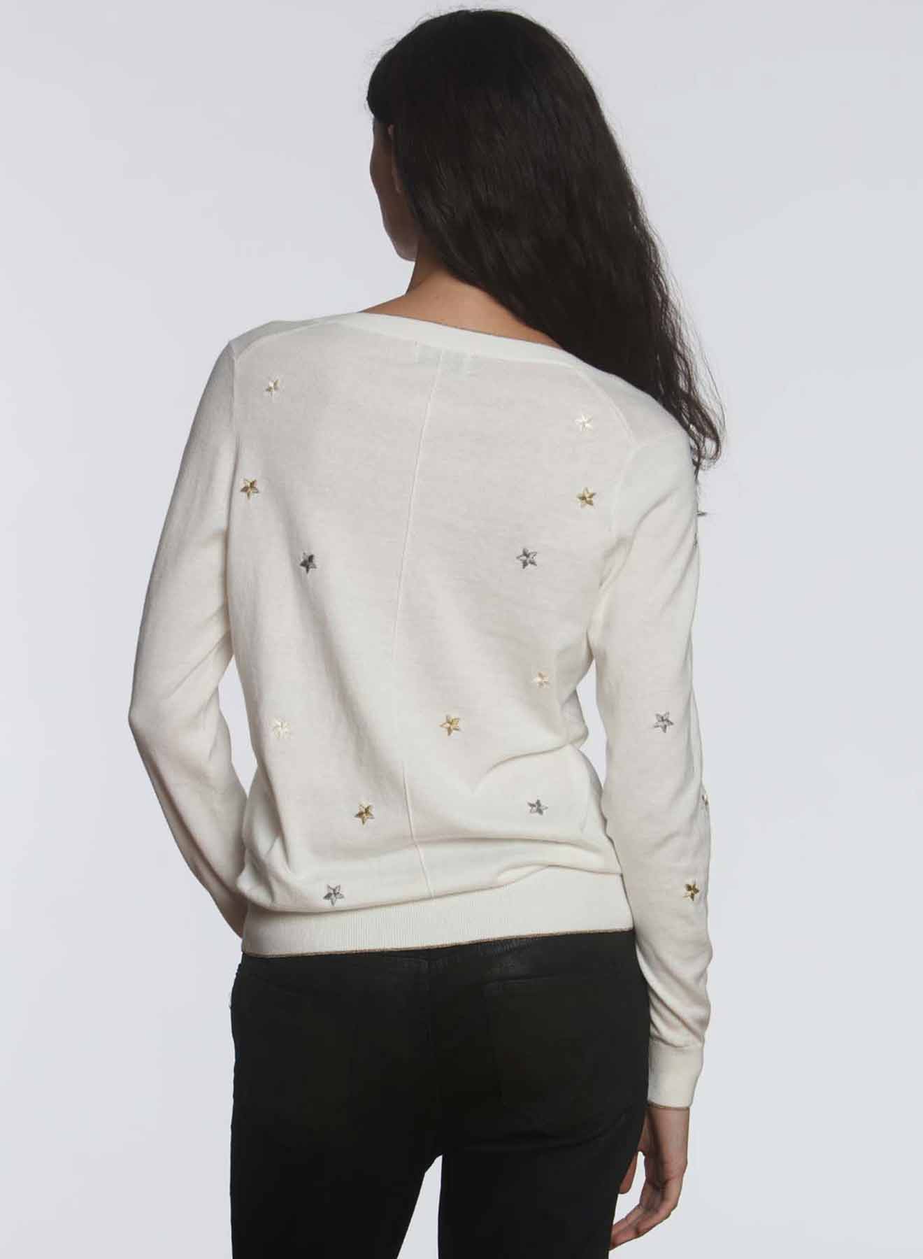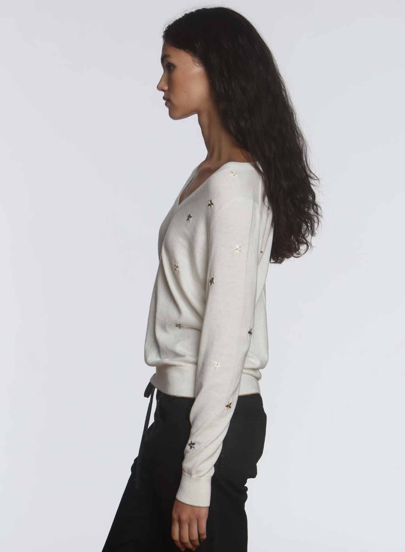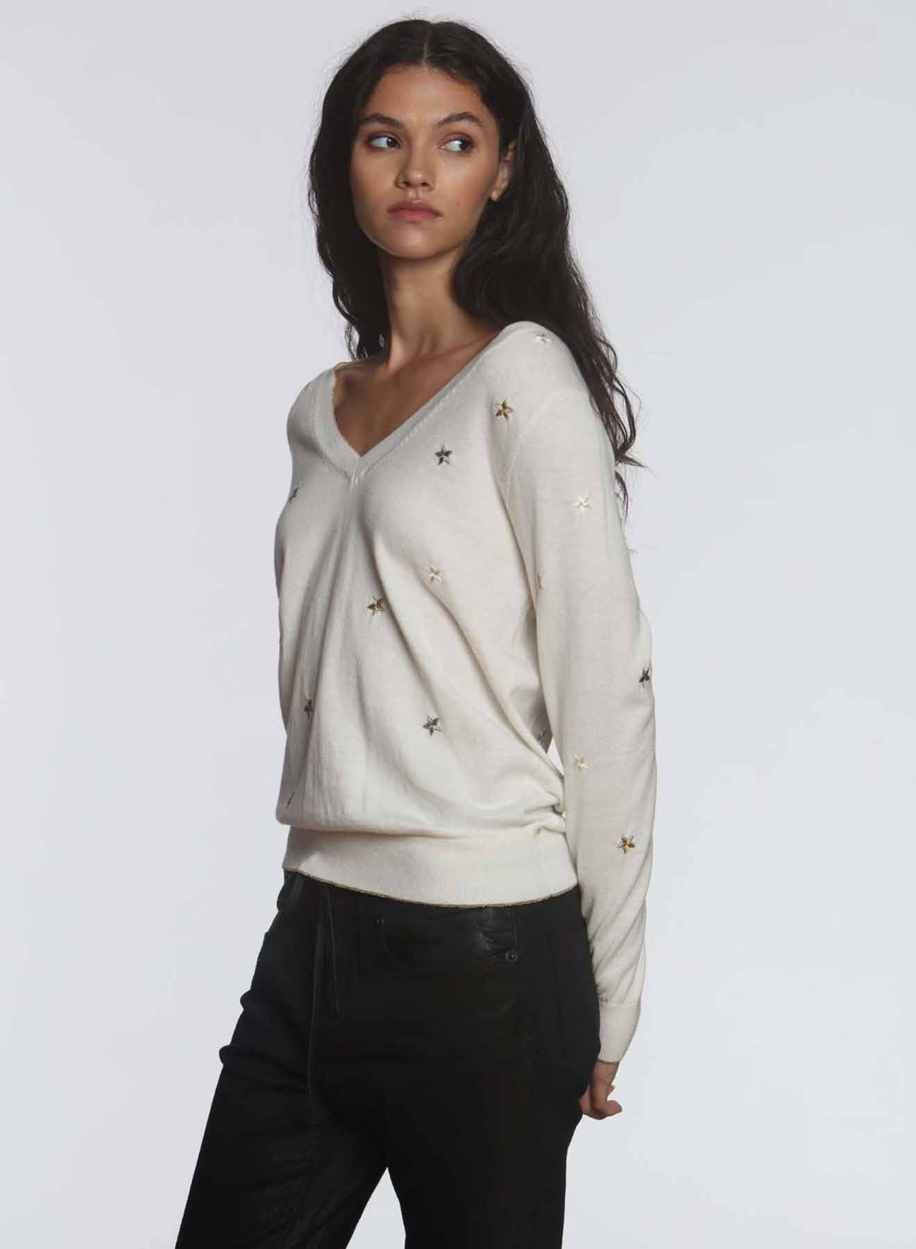 Perfect for dinner outings as the weather warms up while still carrying a hint of chill, the Bonnie Star Vee is designed to balance cooling and warming needs during seasonal transitions. This slim-fitting top is beautifully adorned with satin stitch star embroideries, delivering a subtle dress-up factor, while exposed seam and Lurex hand stitches at the center back and sides add an unexpected, metallic edge.