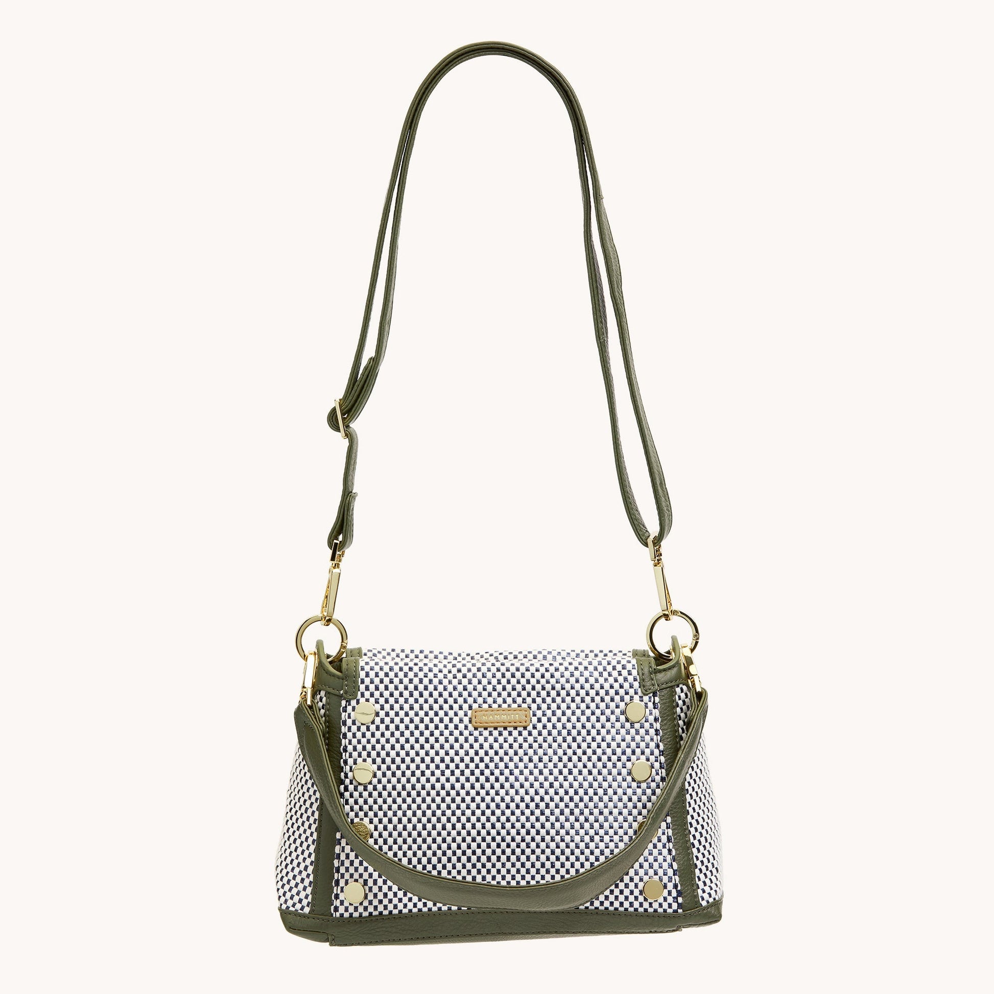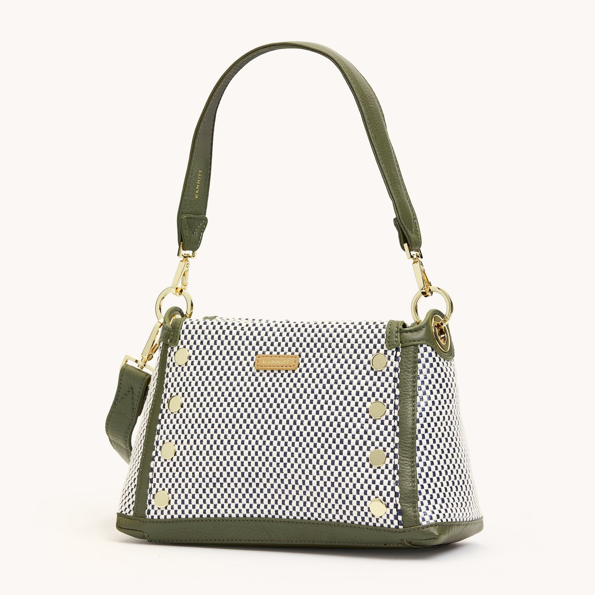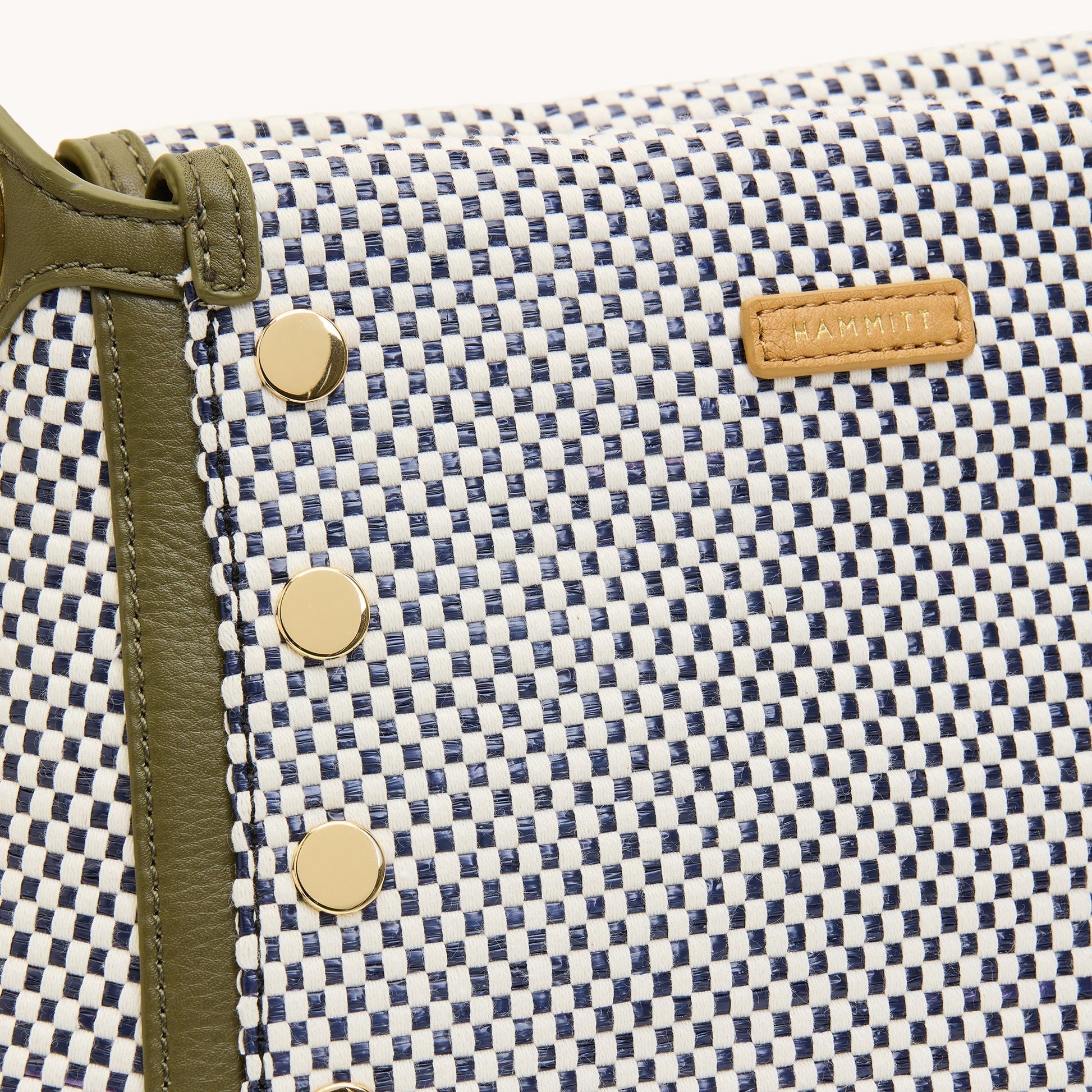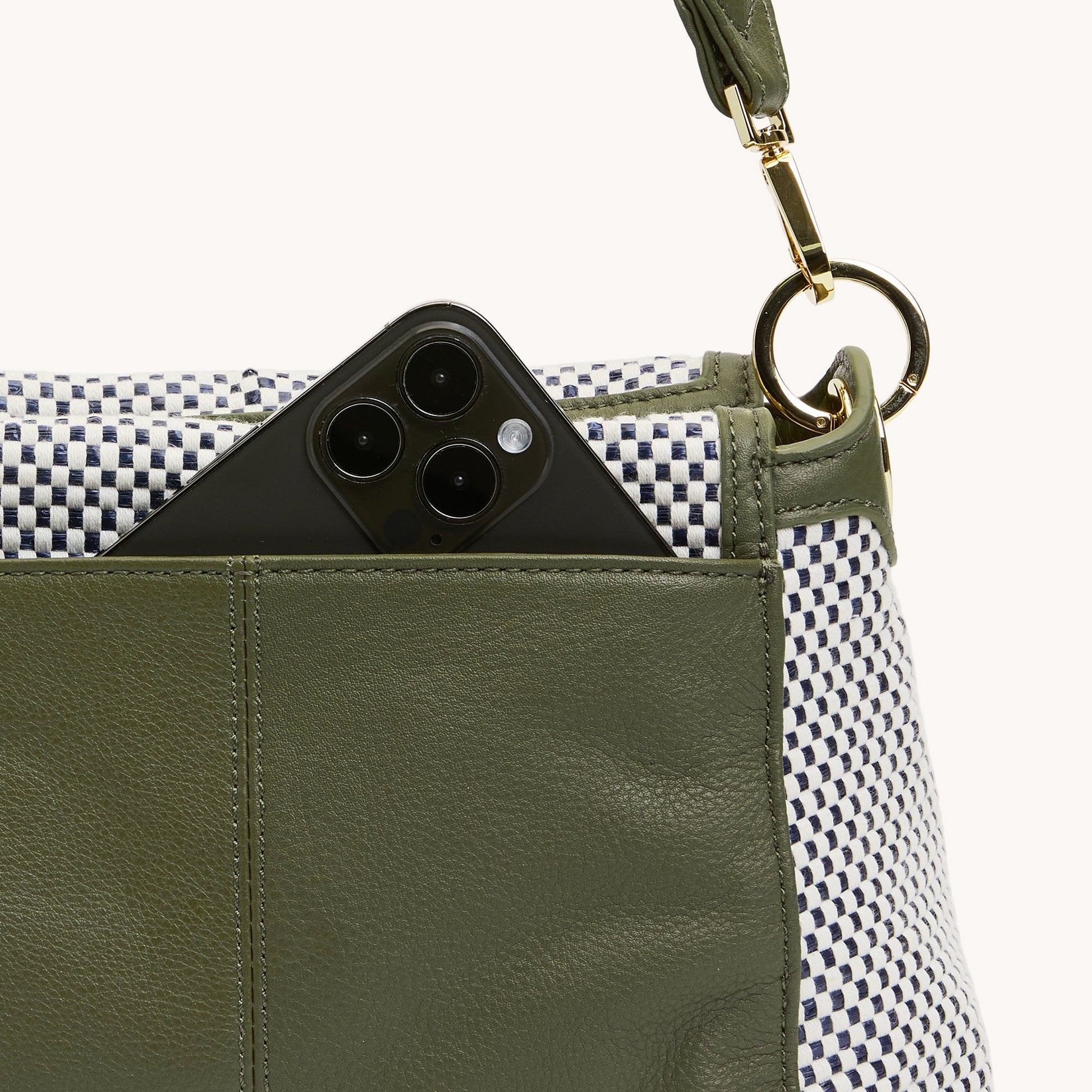 Meet the Bryant Medium, a space-efficient bag with ample room and easy access. It’s crafted from a tight cotton and cord weave in white and deep navy, accented by soft green leather and gleaming gold hardware that’s guaranteed for life