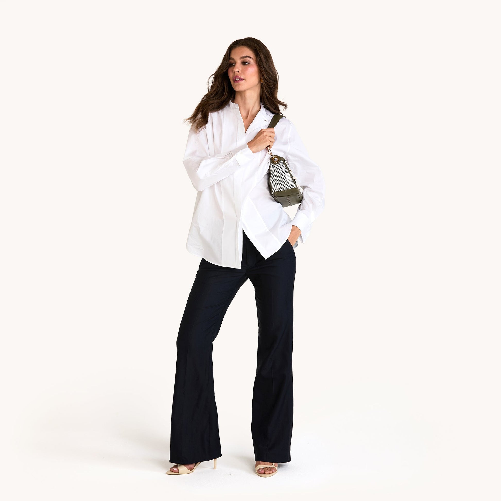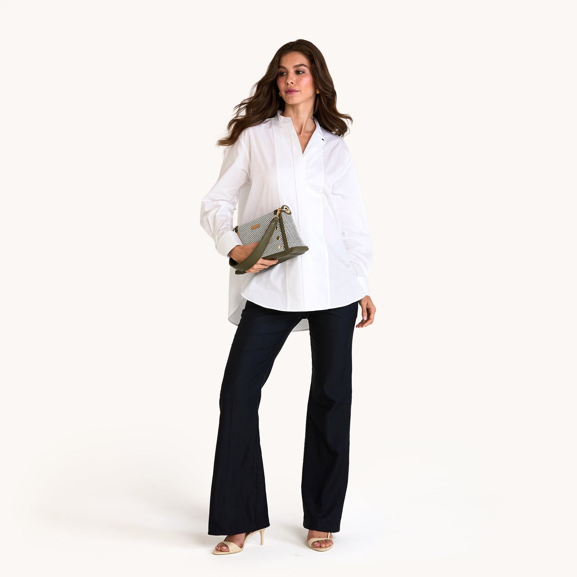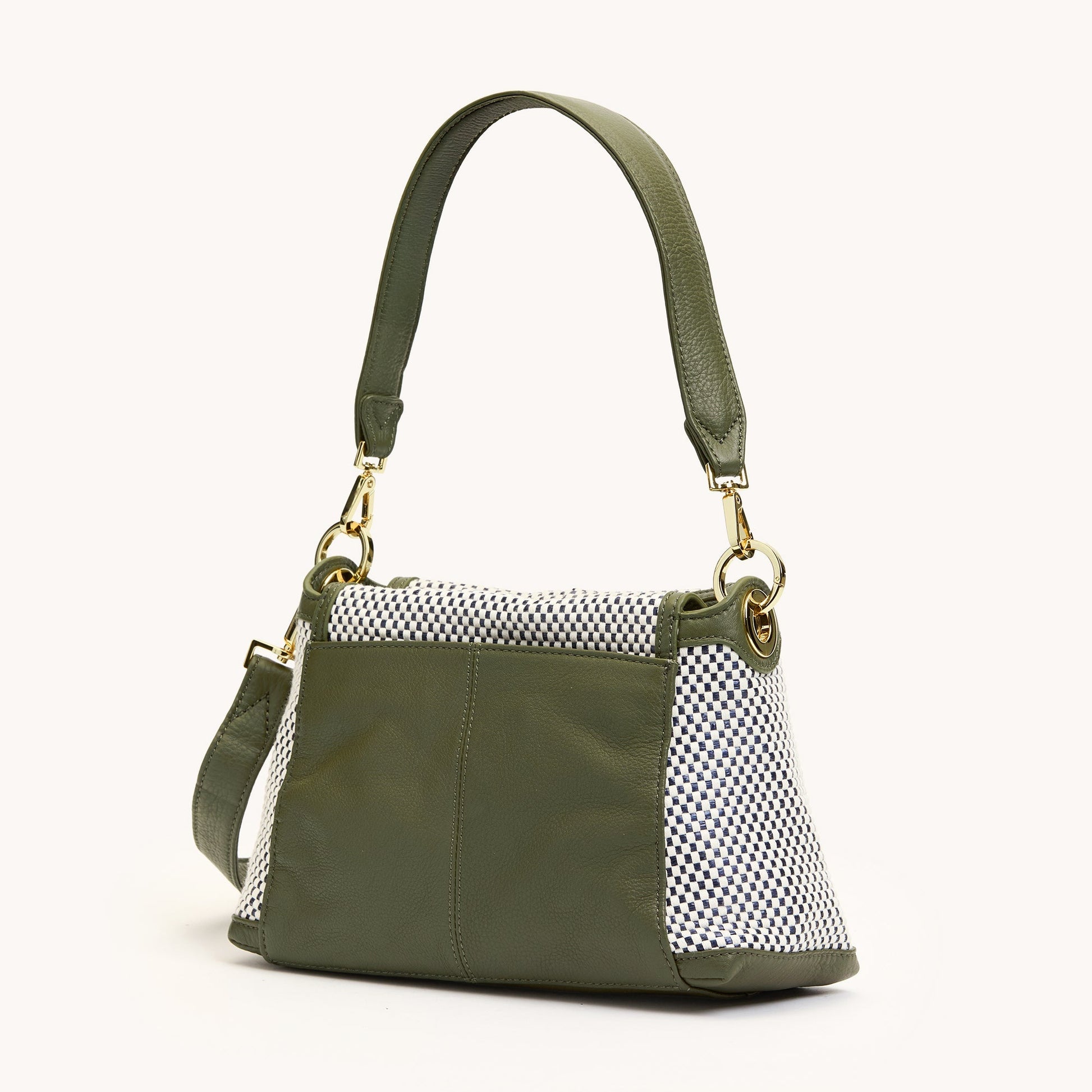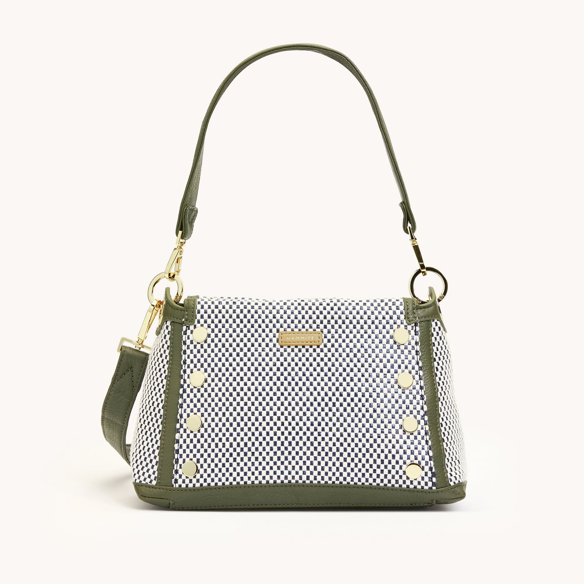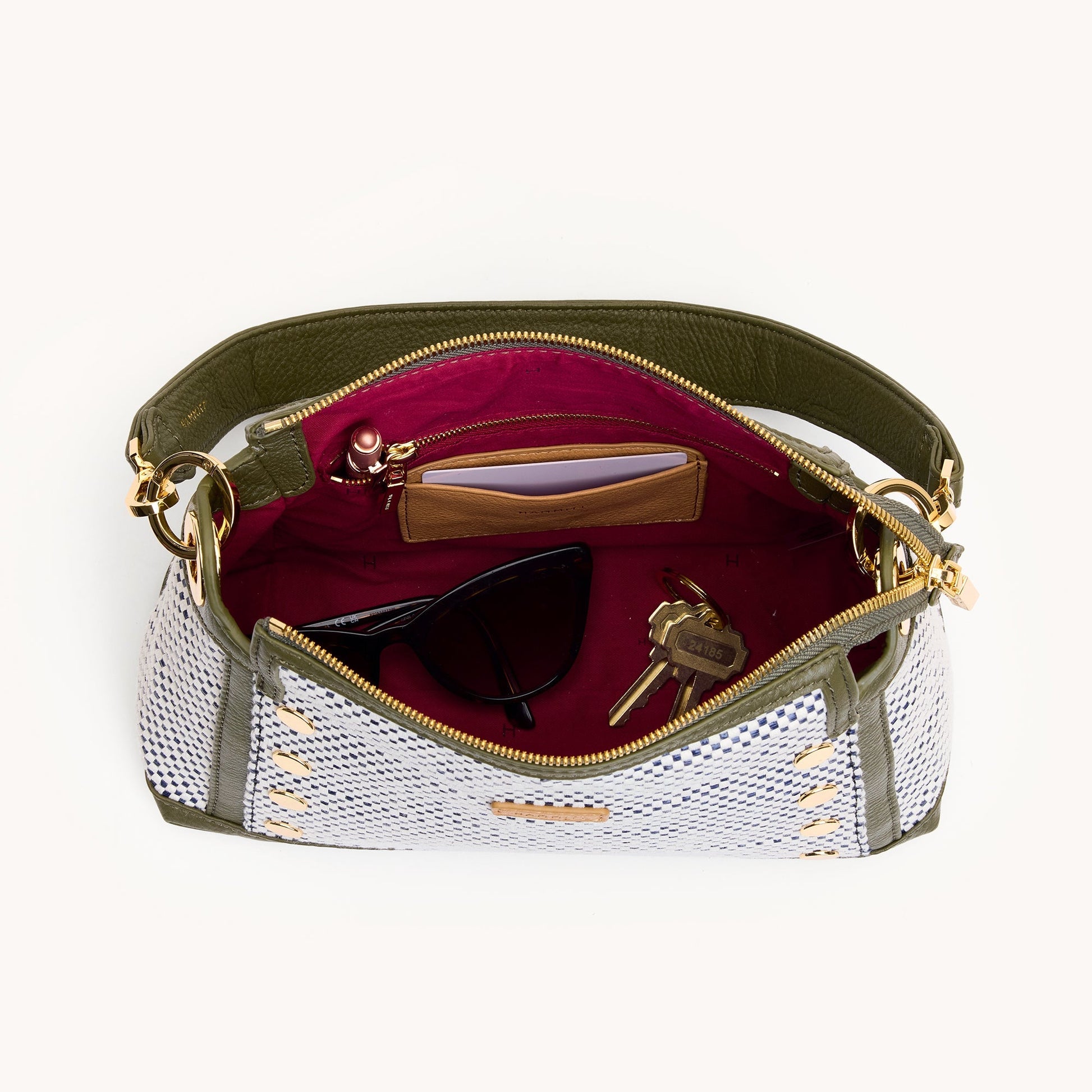 Meet the Bryant Medium, a space-efficient bag with ample room and easy access. It’s crafted from a tight cotton and cord weave in white and deep navy, accented by soft green leather and gleaming gold hardware that’s guaranteed for life
