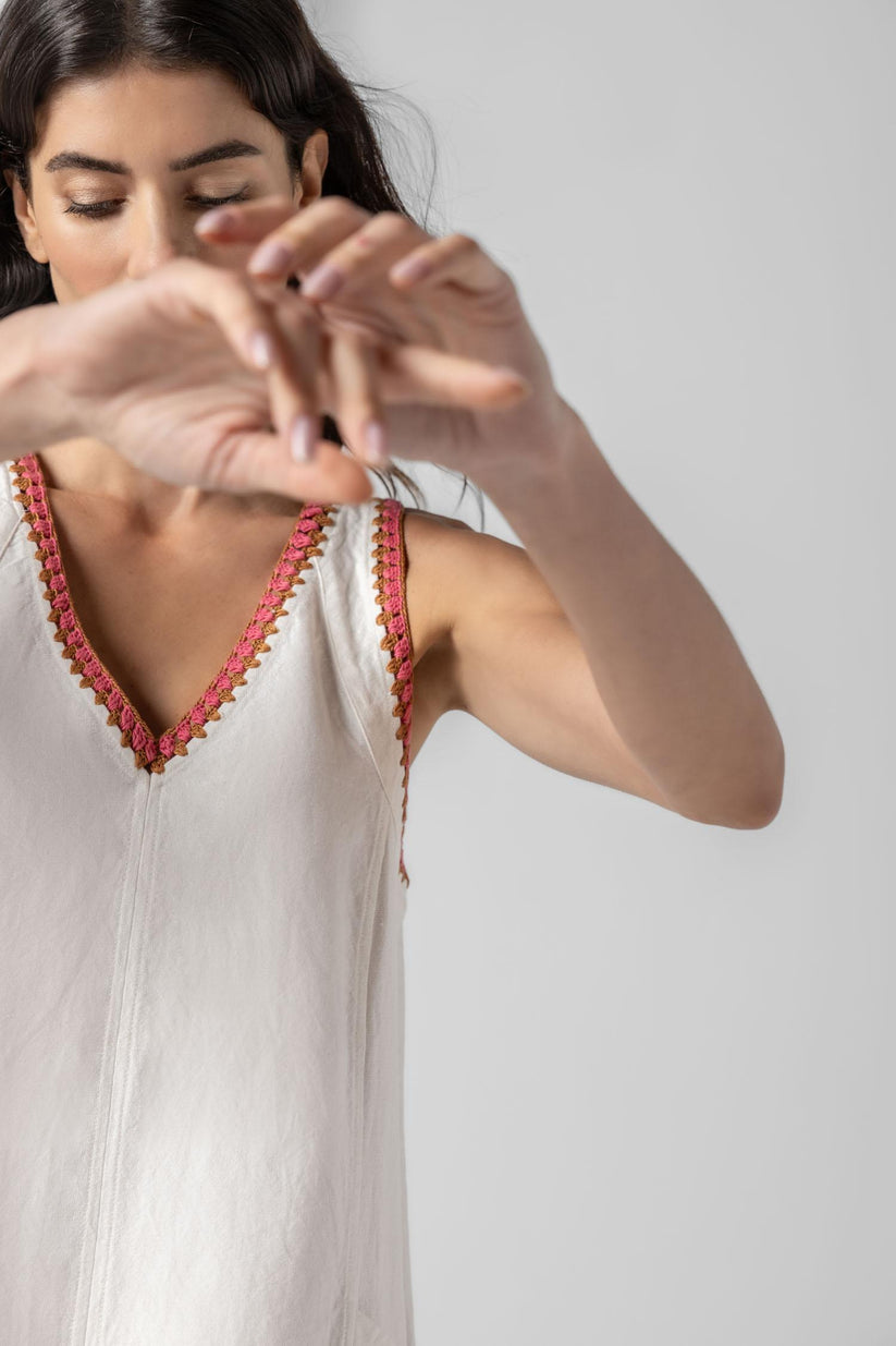 The Crochet Trim V-Neck Dress blends structured comfort with artisanal charm. Made from a heavier-weight cotton-linen blend, it features hand-crocheted trim at the feminine V-neckline. The simple shift shape, side pockets, and above-the-knee length make it an effortless choice for summer outings