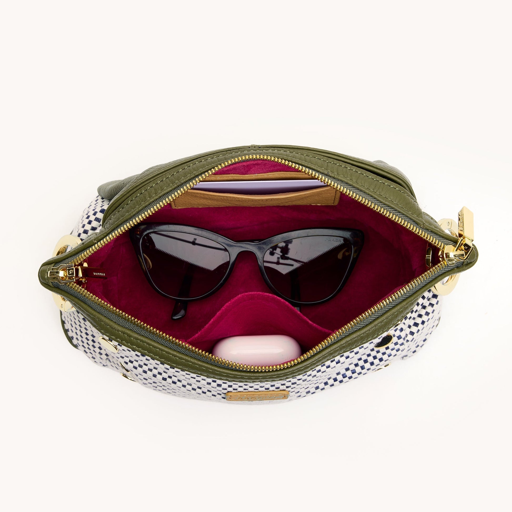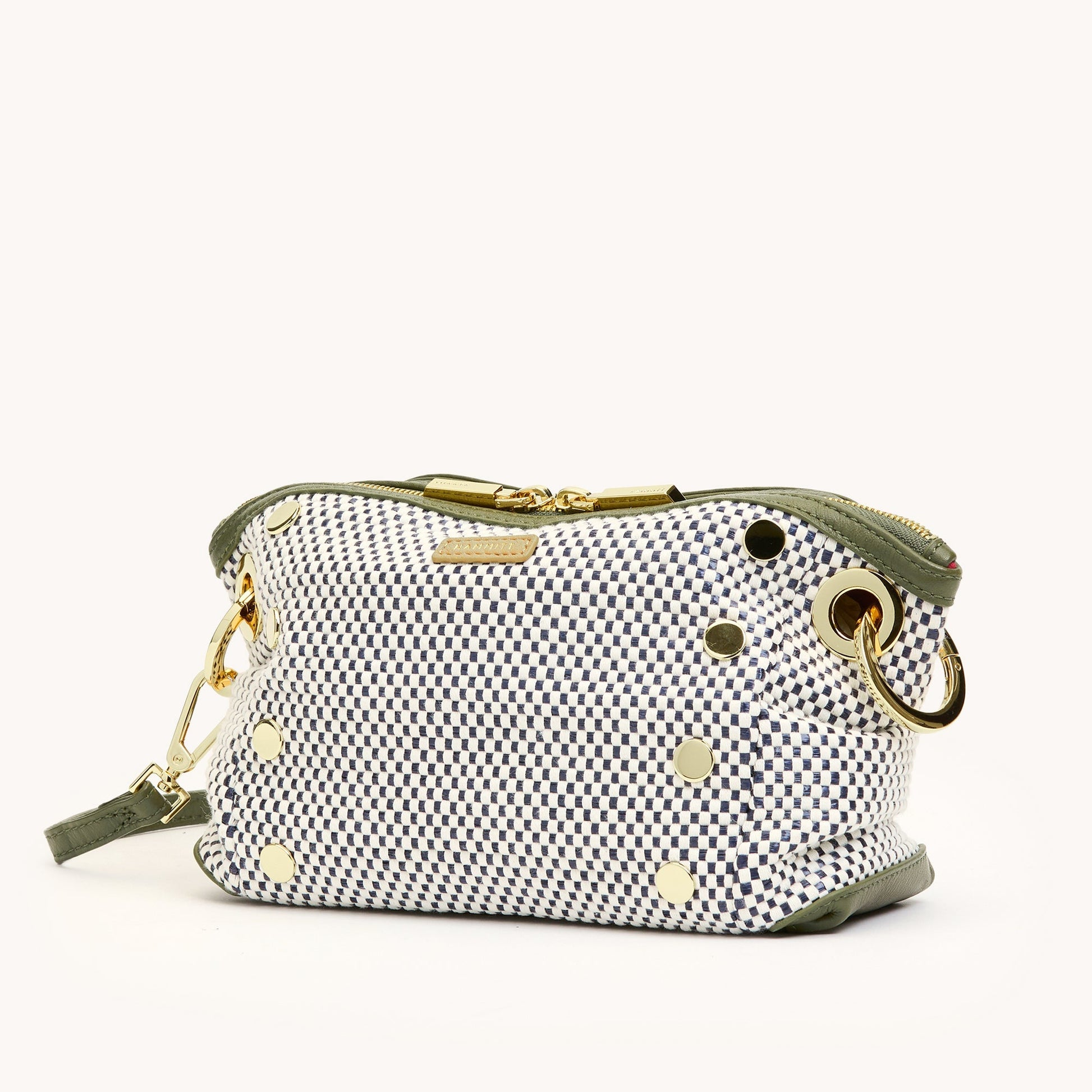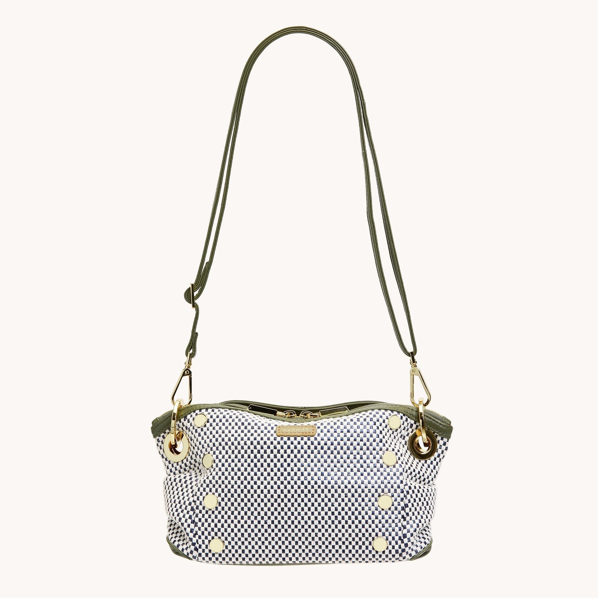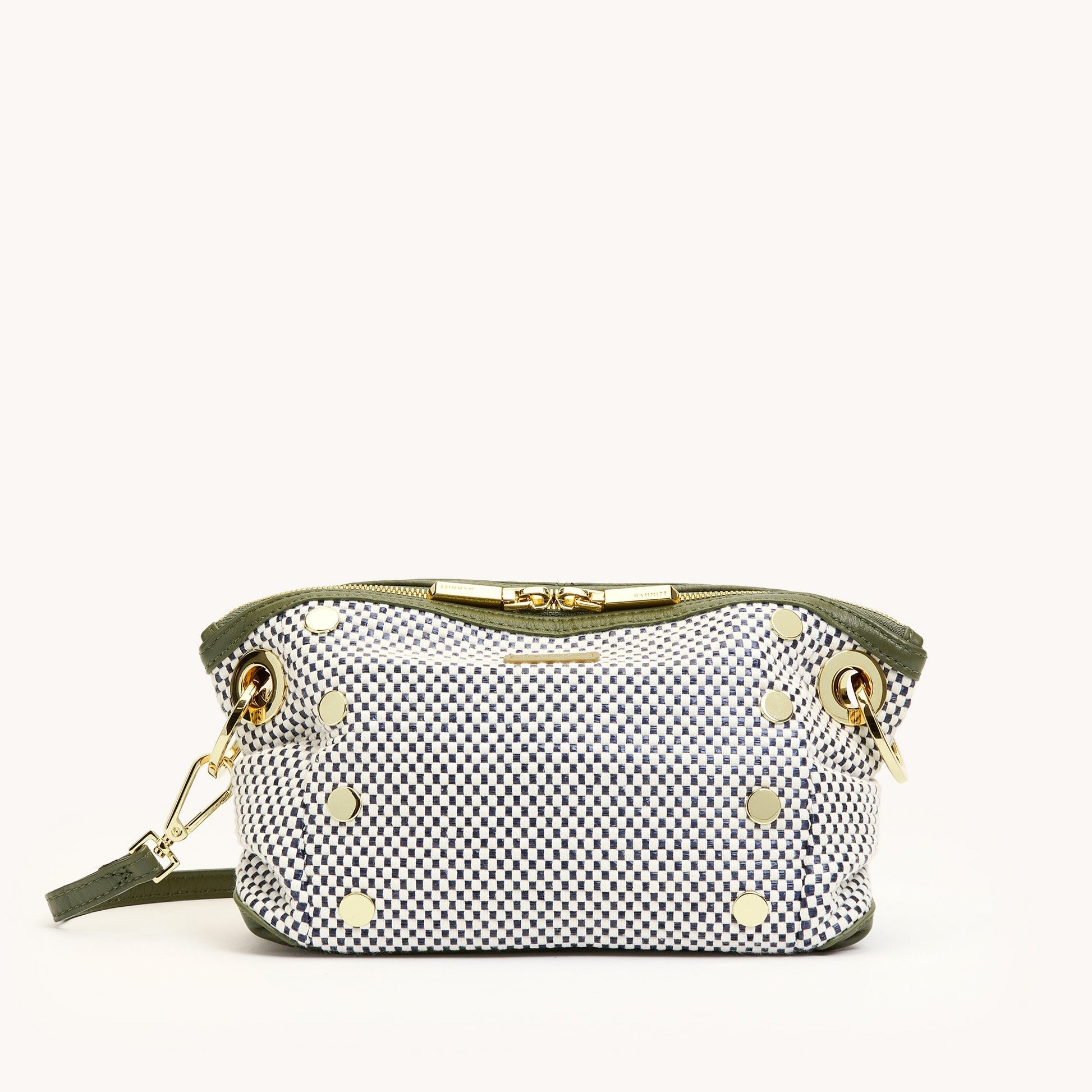 Tight cotton and cord weave in white and deep navy paired with soft green leather accents