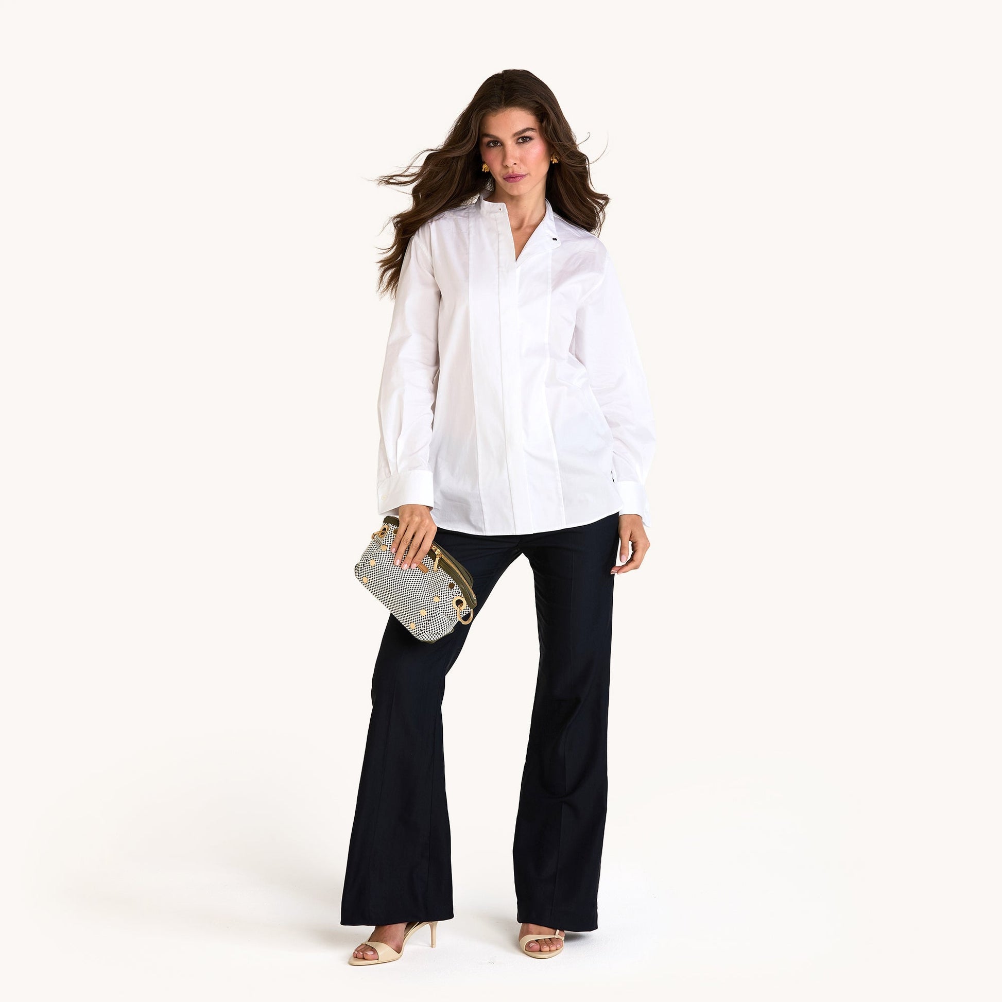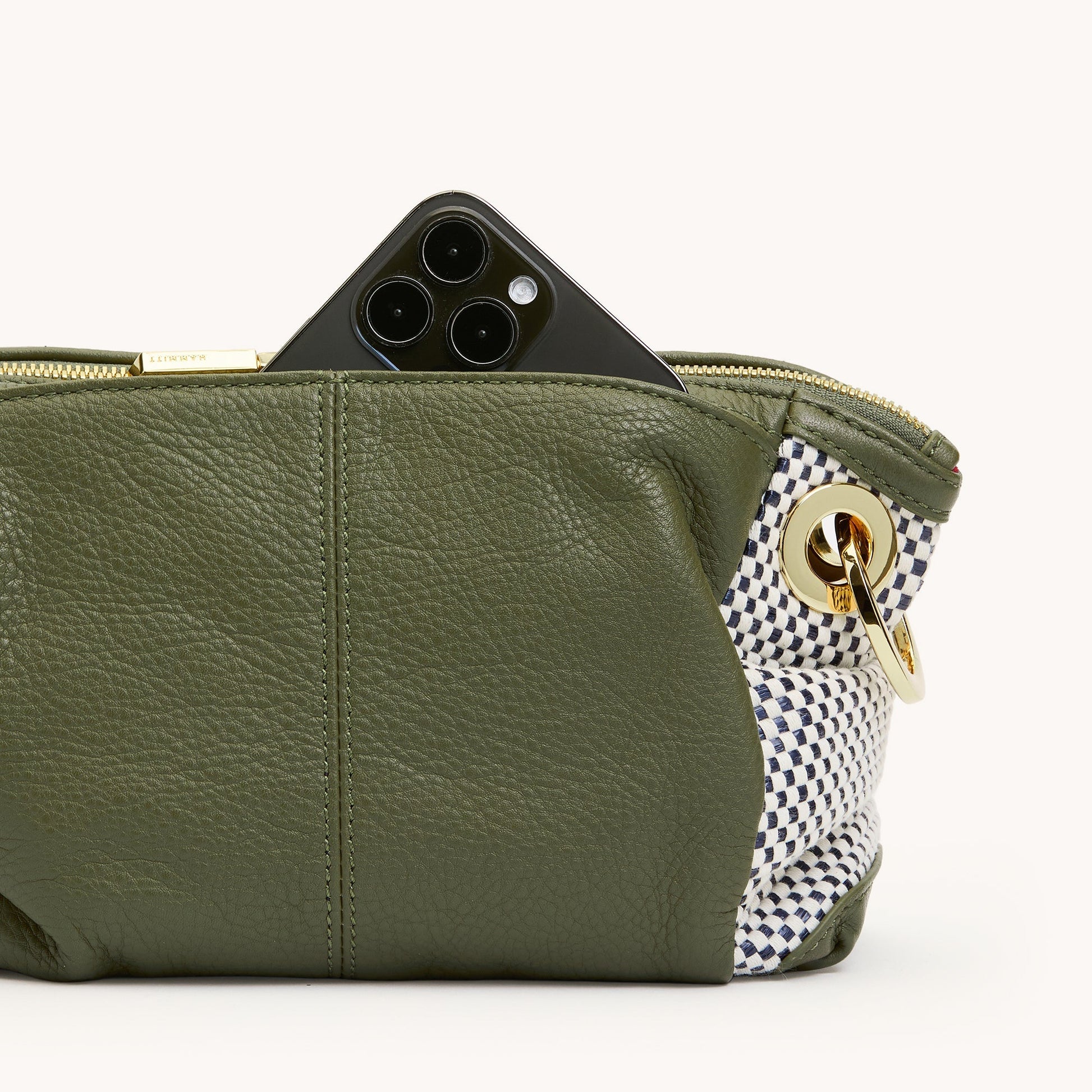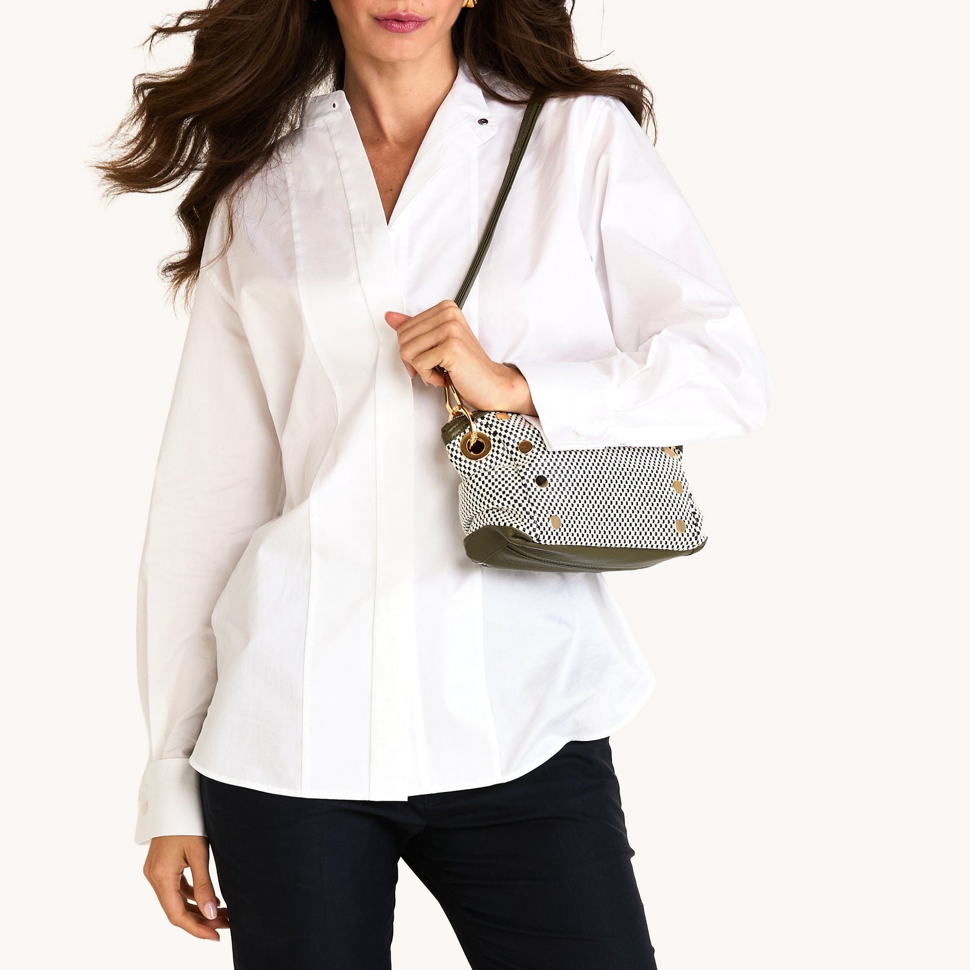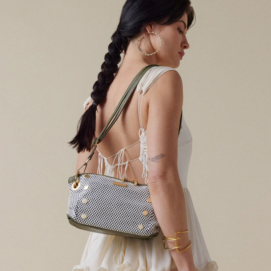 Tight cotton and cord weave in white and deep navy paired with soft green leather accents