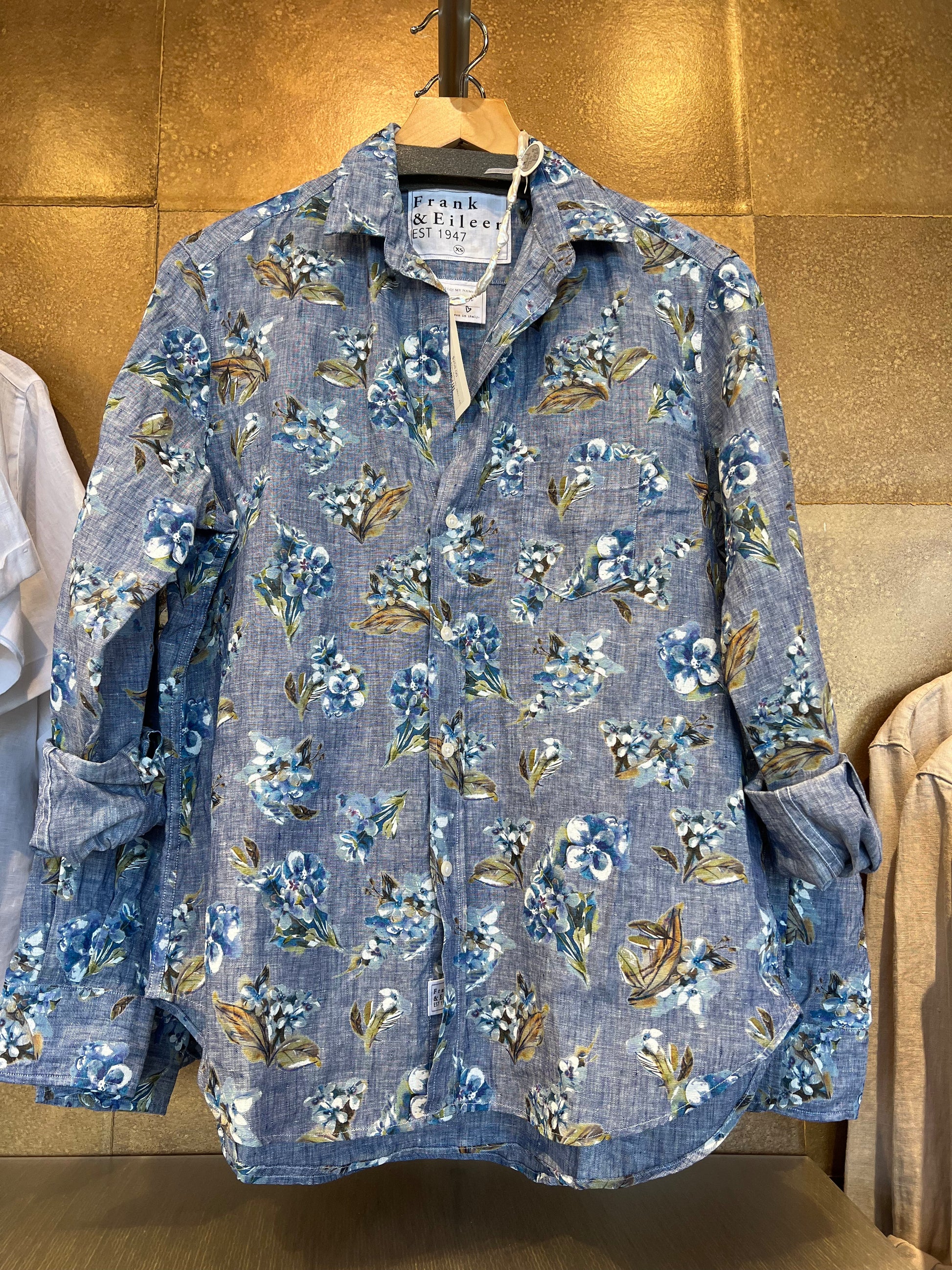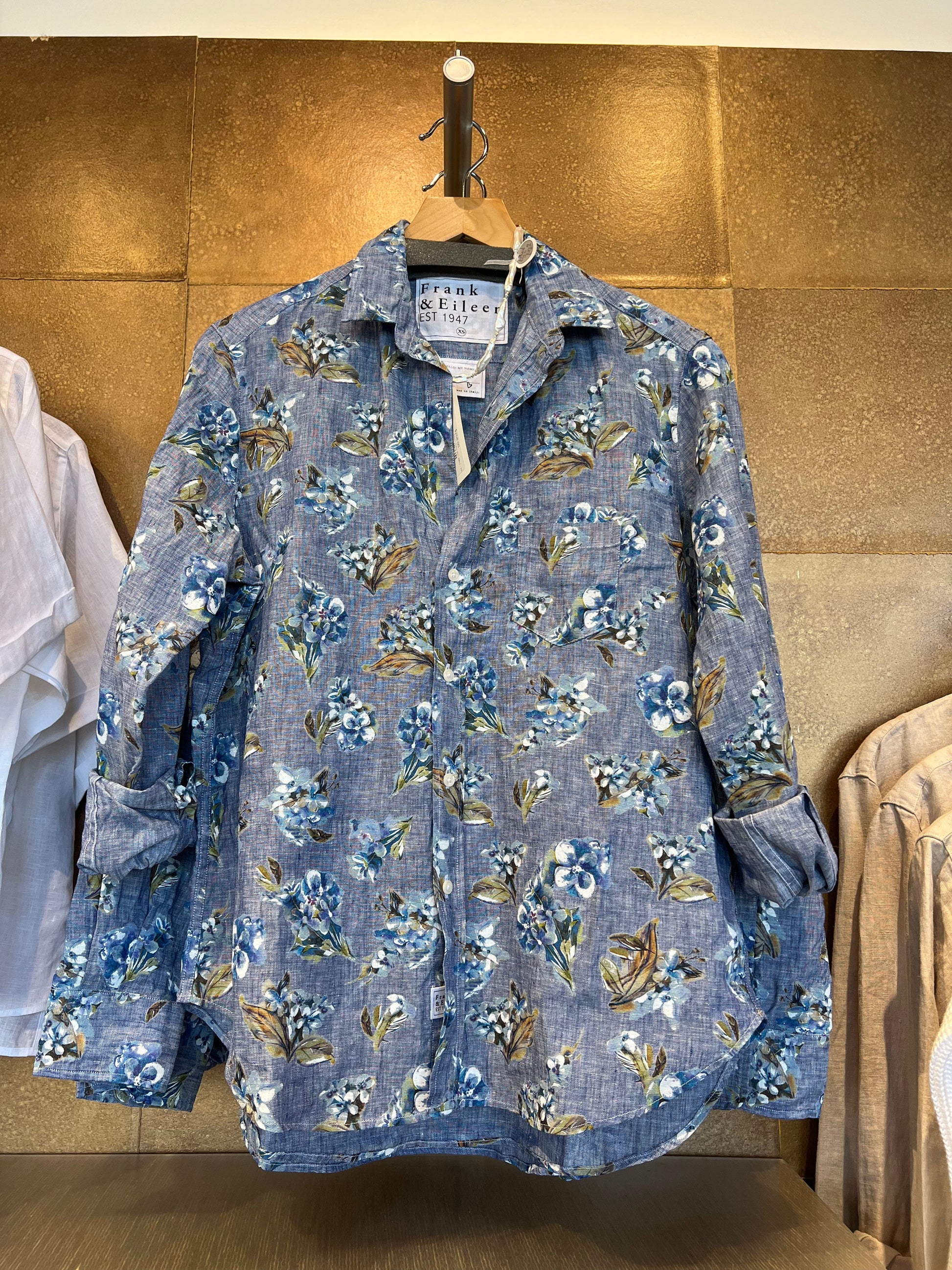Frank & Eileen’s signature relaxed-fit linen shirt in a soft blue and white rope print