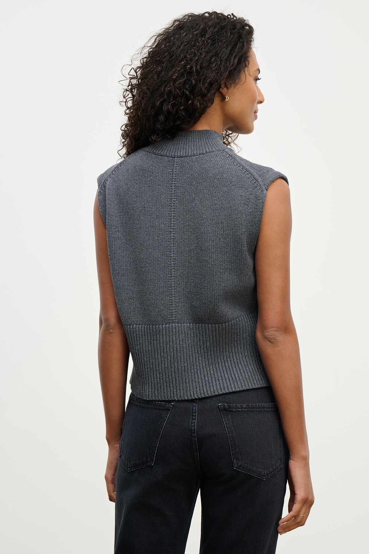 A modern layering essential, the Electra Sweater Vest comes in a soft medium heather grey. With its sleek sleeveless silhouette, ribbed hem, and clean knit finish, this versatile piece can be styled alone or layered over a button-down for fall.