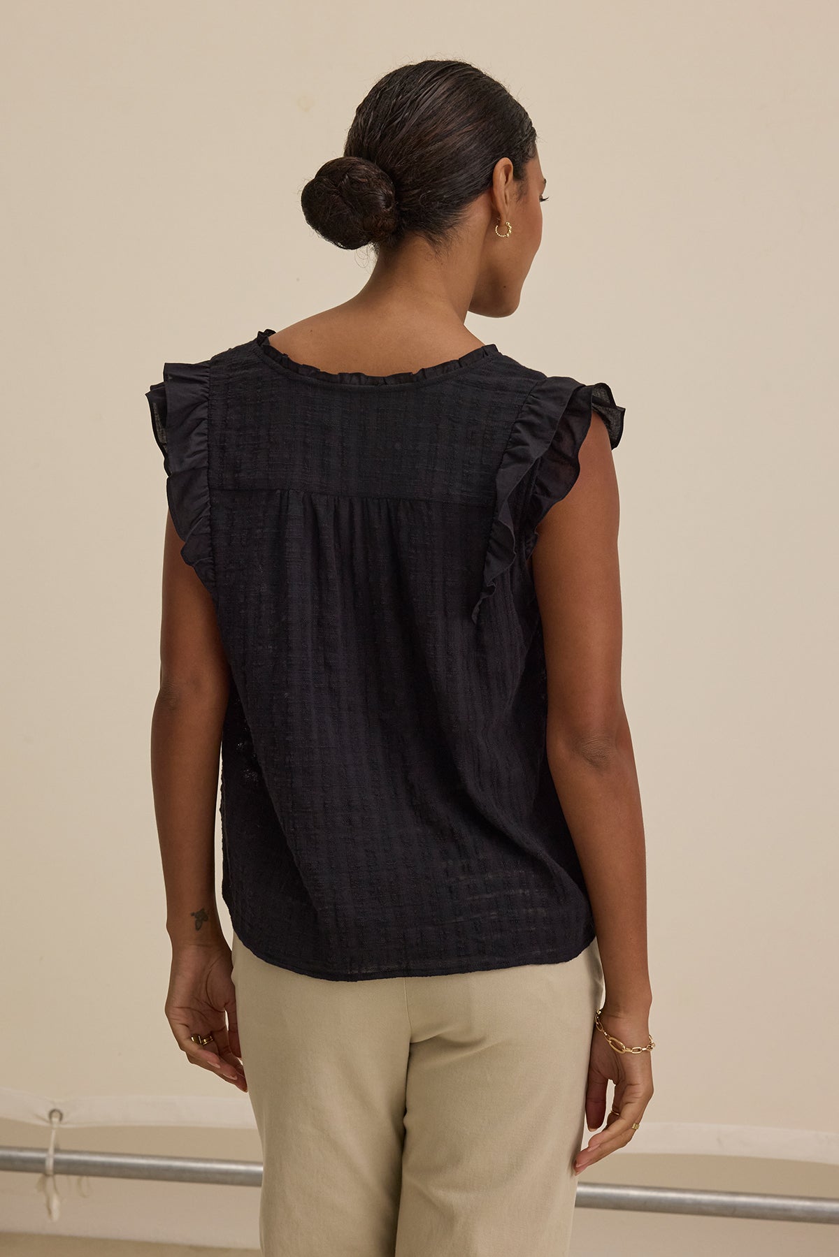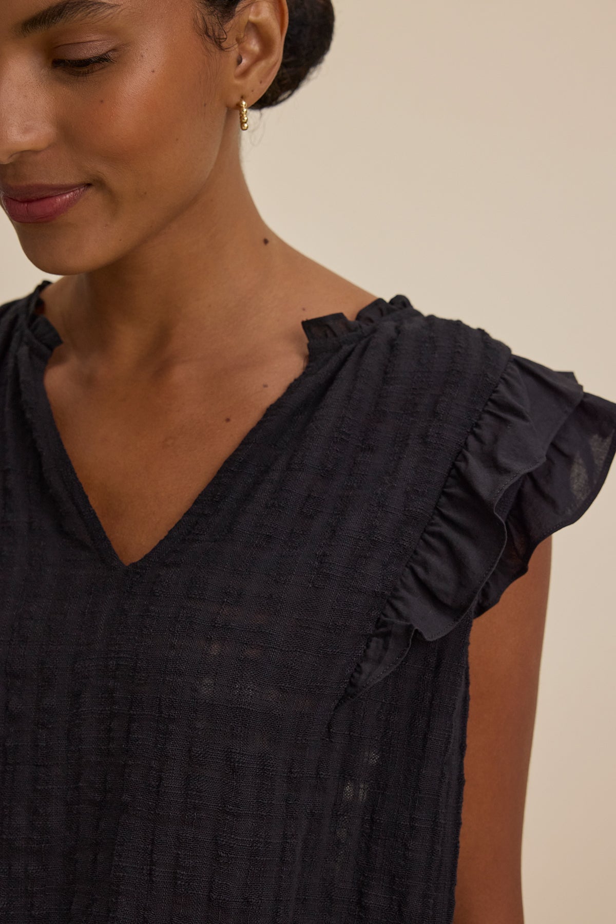 The Eva Top is a feminine take on a classic warm-weather essential. Crafted from lightweight textured gauze, this top offers a breezy, effortless feel with ruffled cap sleeves and a delicate V-neckline. The relaxed silhouette makes it perfect for easy layering or wearing on its own.