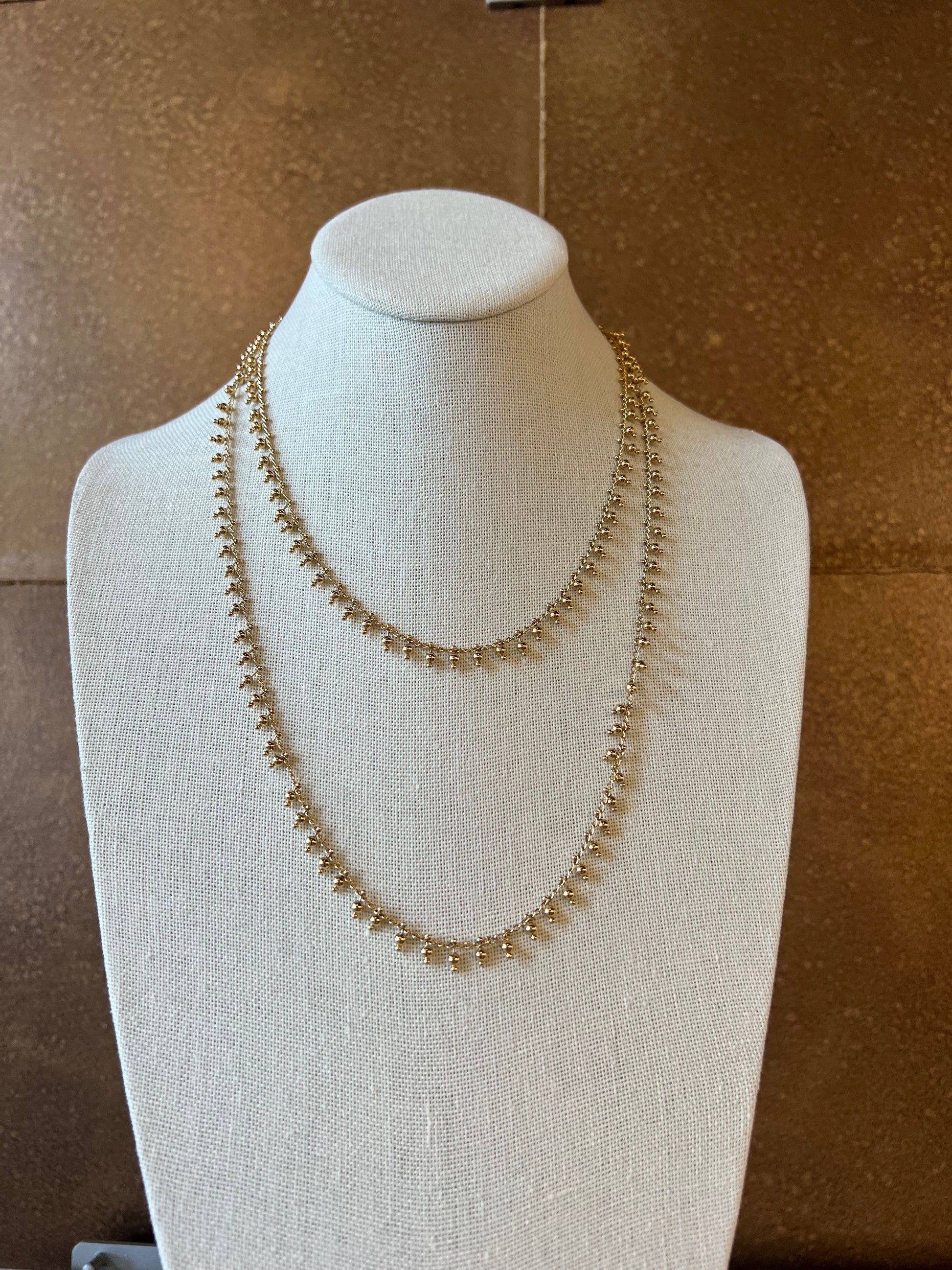 Introducing the Gold Bead Necklace, a long, versatile piece that can be worn doubled for a layered look or as a single strand to accentuate a deep neckline. Crafted from polished gold-plated beads strung on a durable, lightweight chain, this necklace offers subtle sparkle and effortless elegance.