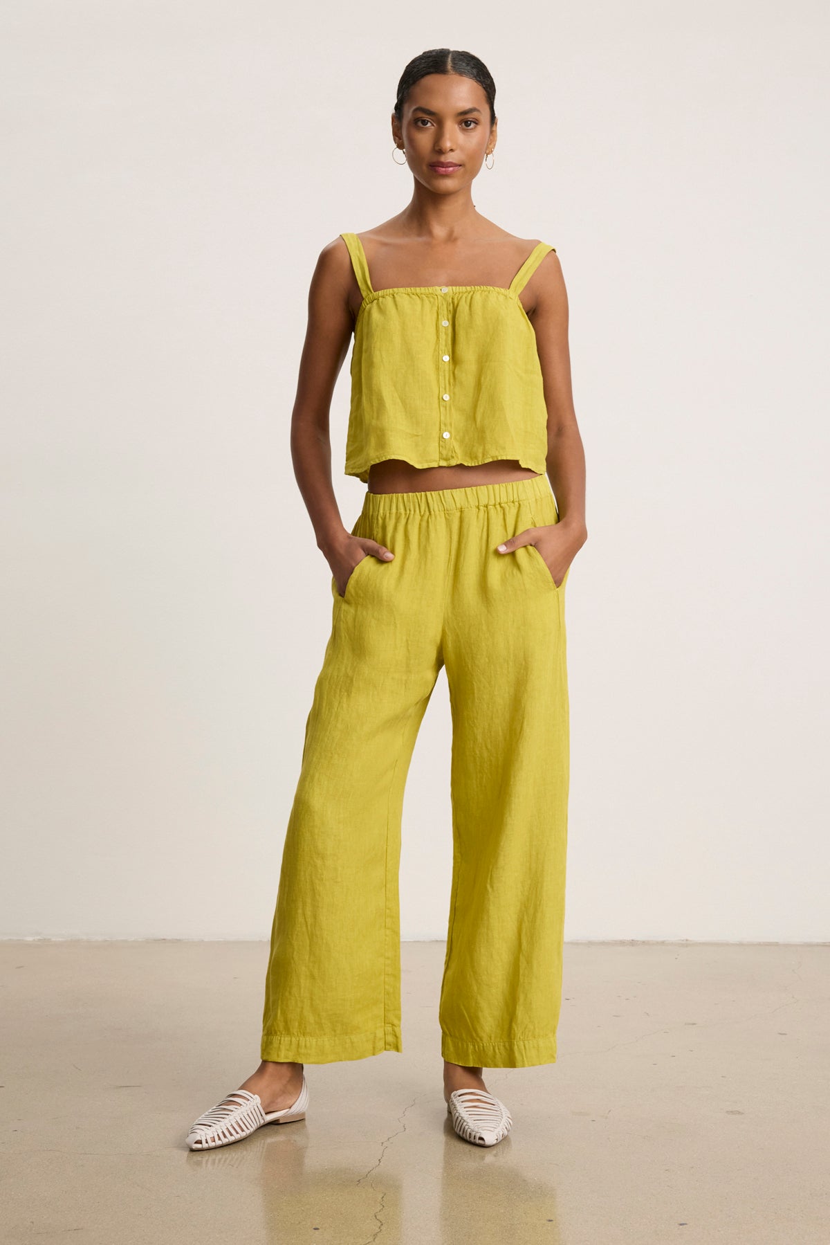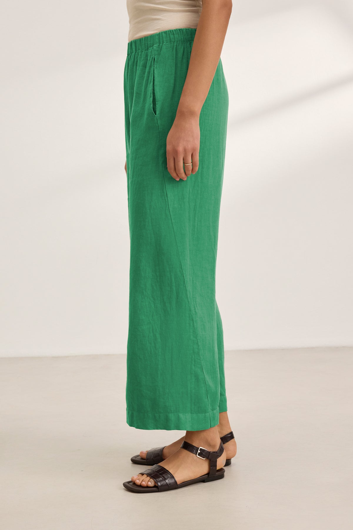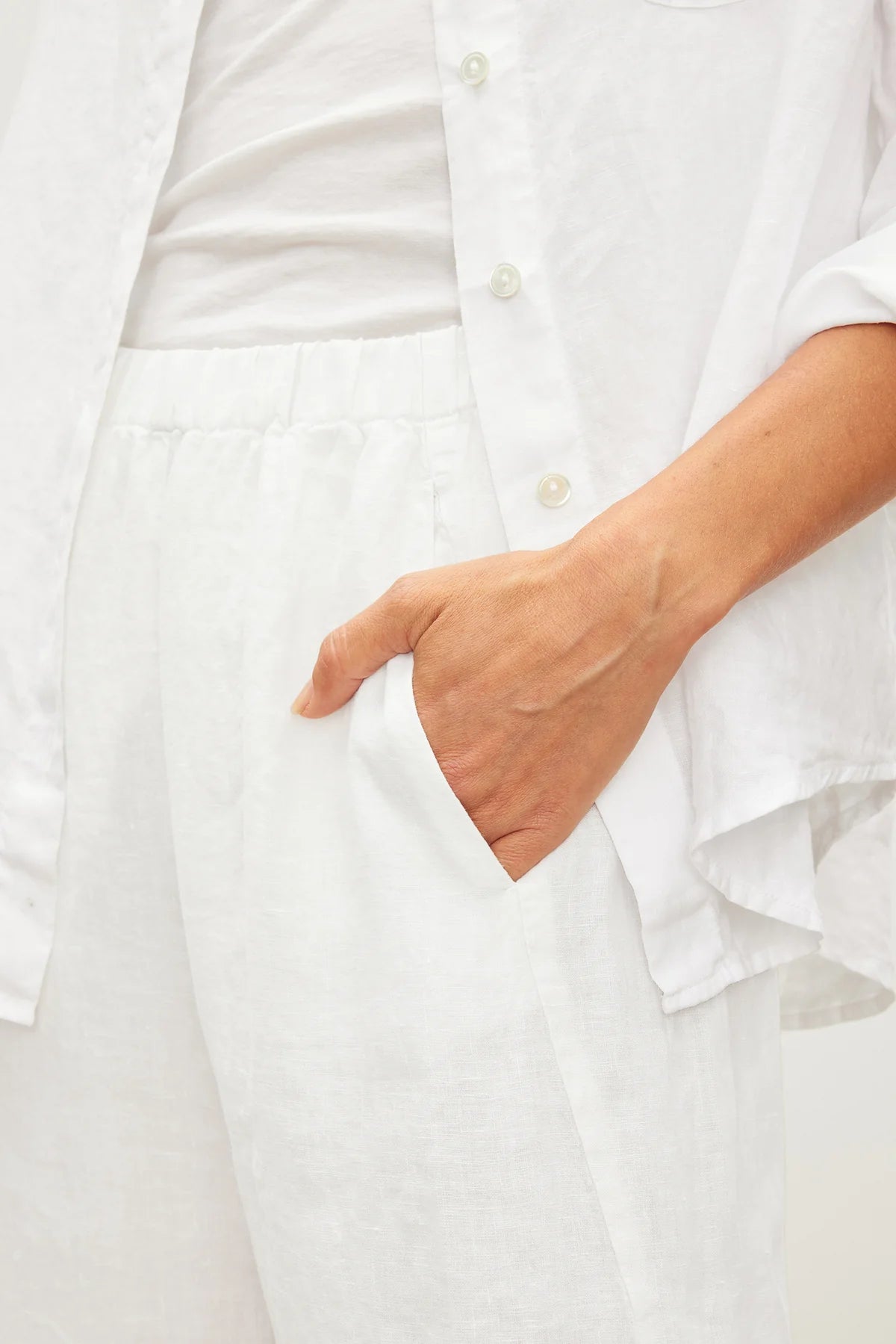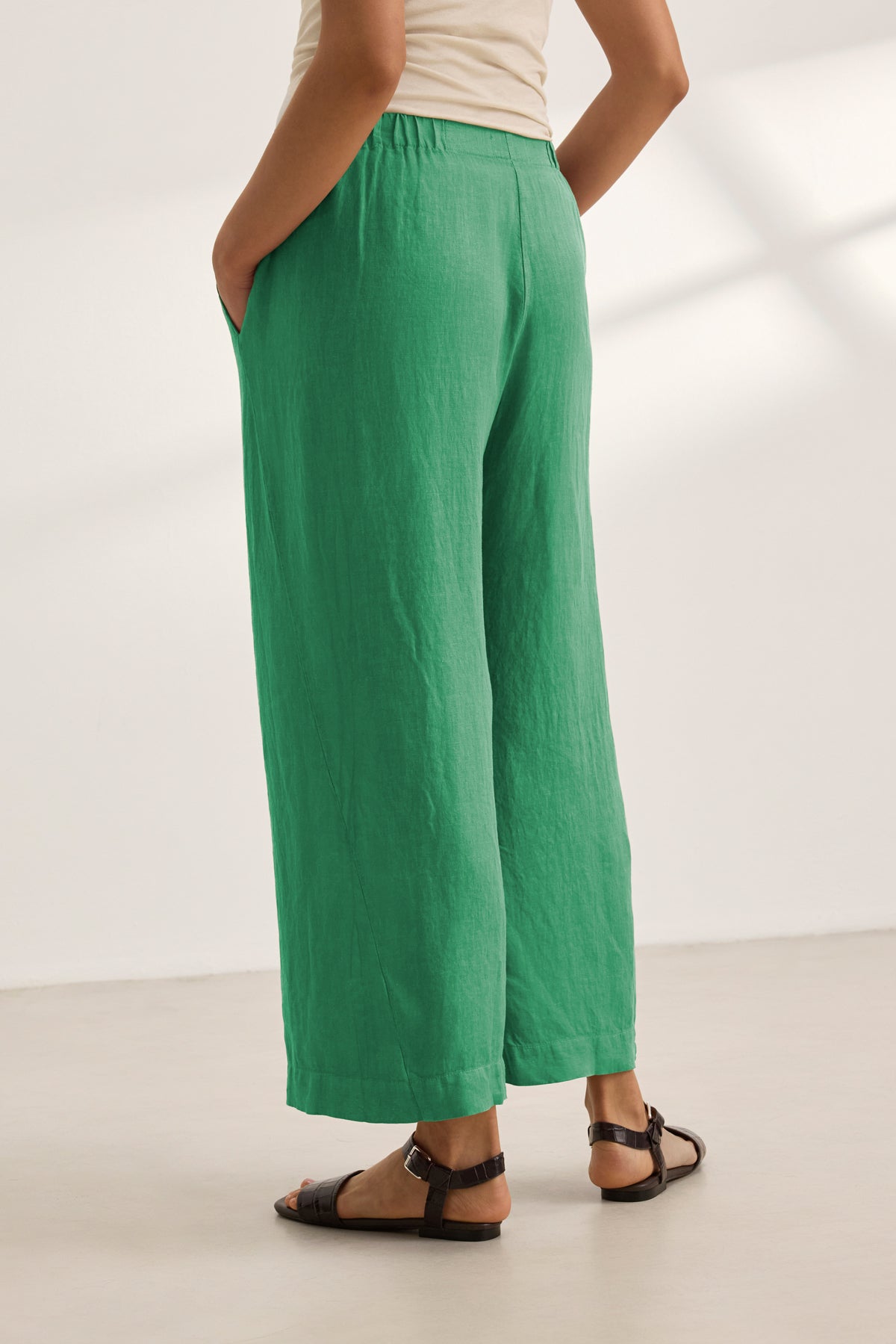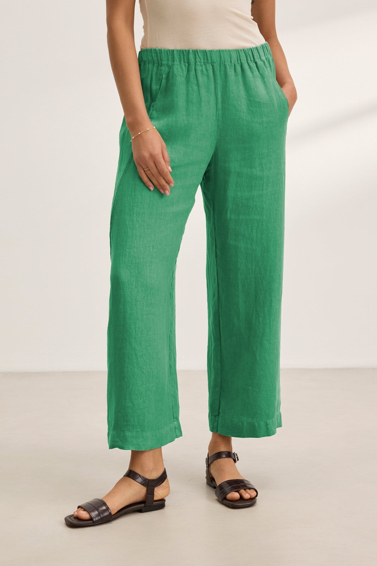These pull-on linen trousers are the ideal choice for warm weather. Crafted from 100% lightweight linen, they offer an elasticized waistband, a relaxed leg with a slight ankle crop, and side pockets for convenience.