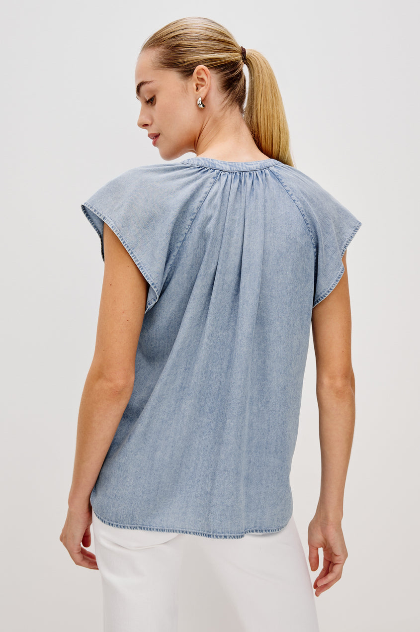 The Maribel Top is crafted from super-soft cotton-denim with a flowy fit and feminine touches including a deep V-neckline and ruffled detailing