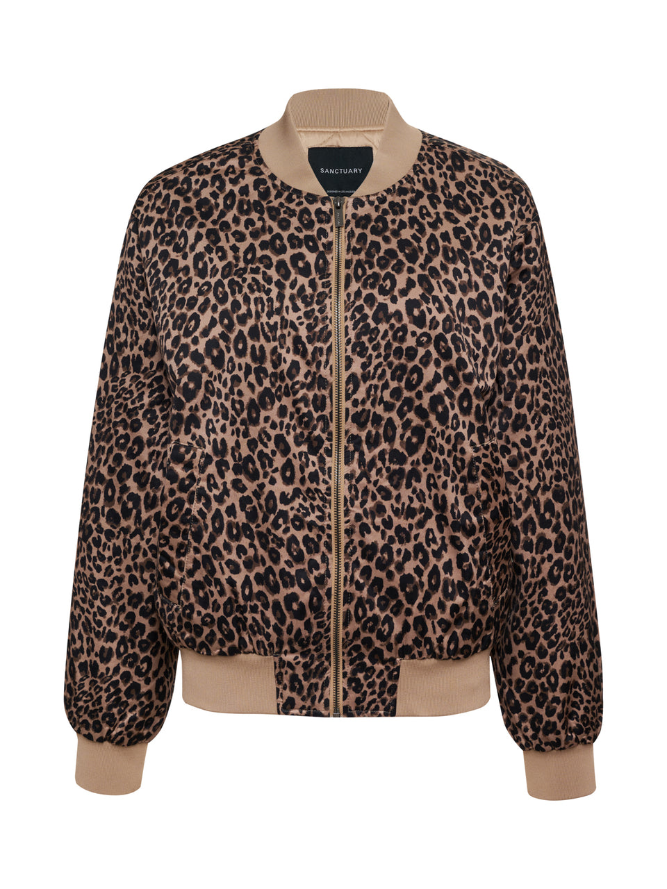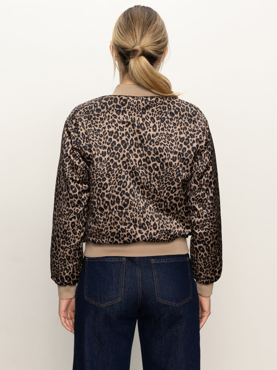 A playful take on the classic bomber, featuring bold leopard print and a soft sateen finish