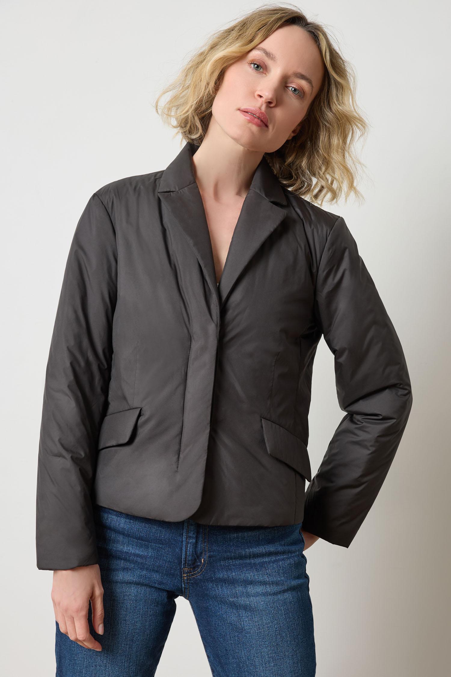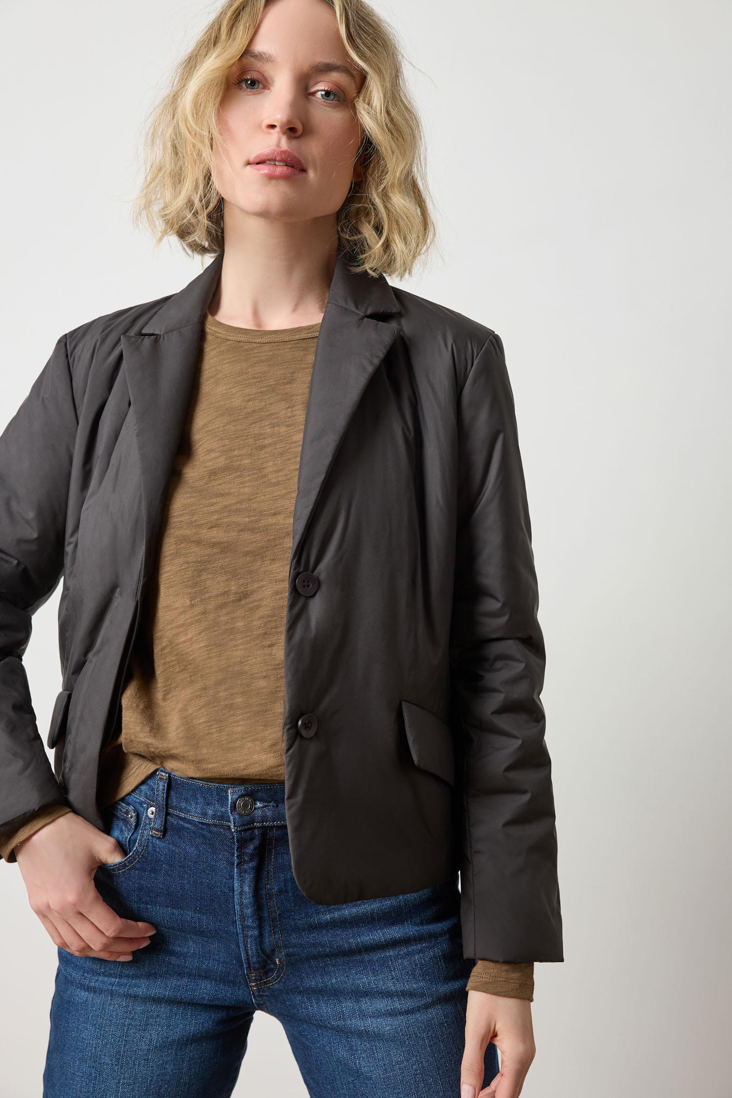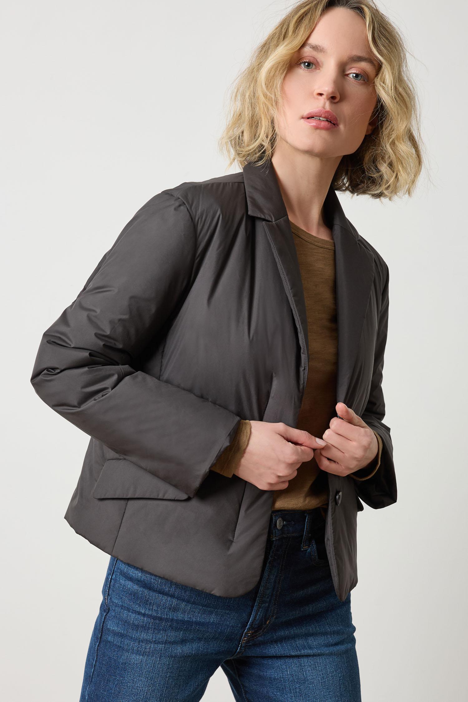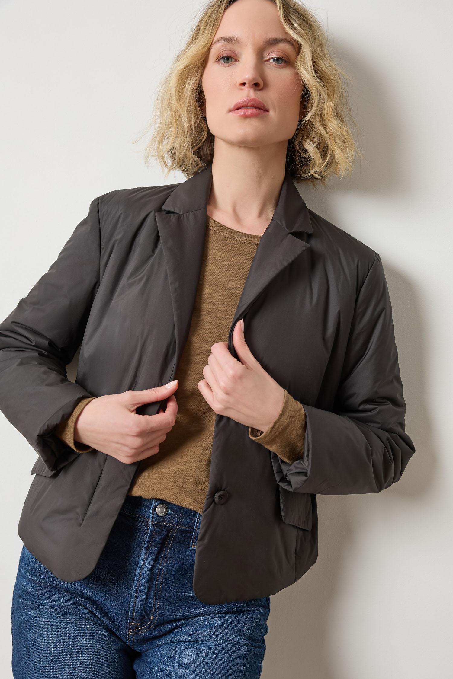 A blazer with puffer-level comfort. This lightweight, softly padded layer gives you polished structure without the bulk, making it an easy throw-on for work, weekend, and travel. Wear it open over a tee or button it up for a clean, modern look—either way, it’s the effortless third piece you’ll reach for on repeat.