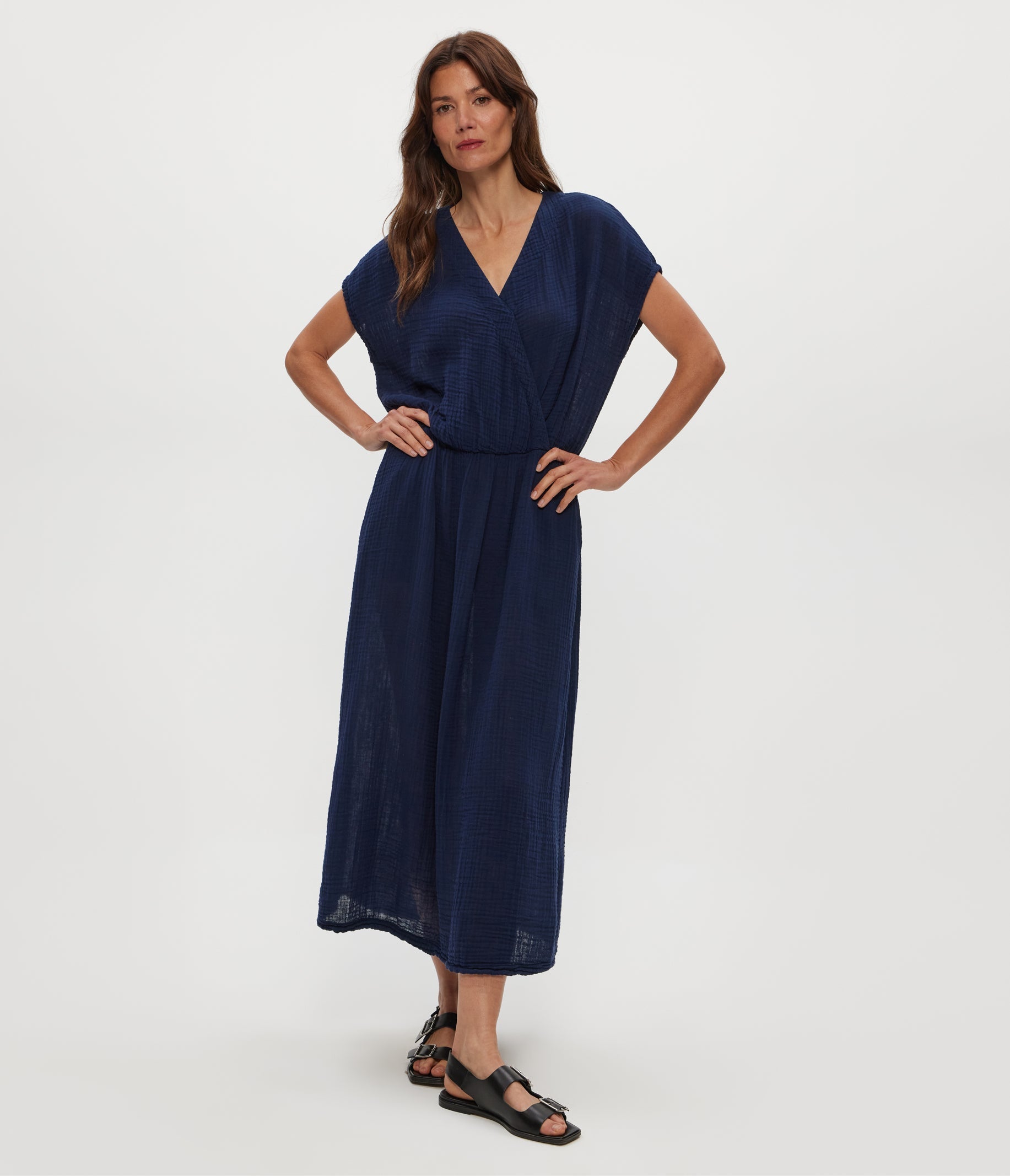 This flowing midi dress features a surplice neckline, drop shoulders, and short sleeves for a relaxed, effortlessly chic look. Crafted in lightweight double gauze, it drapes beautifully for your most breezy moments