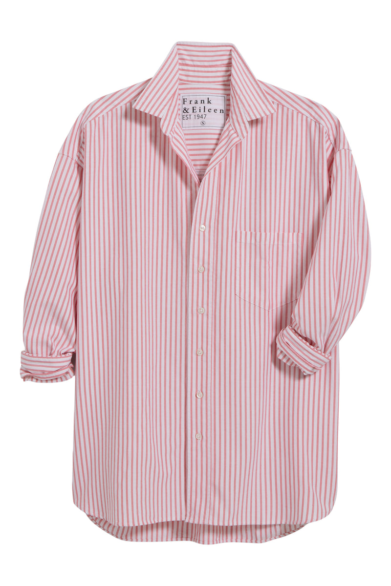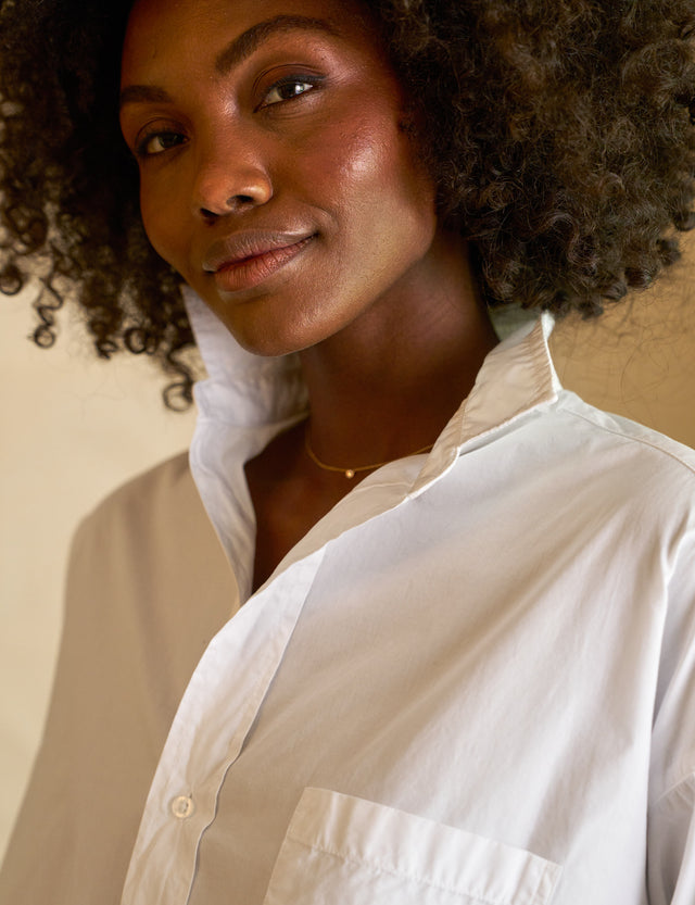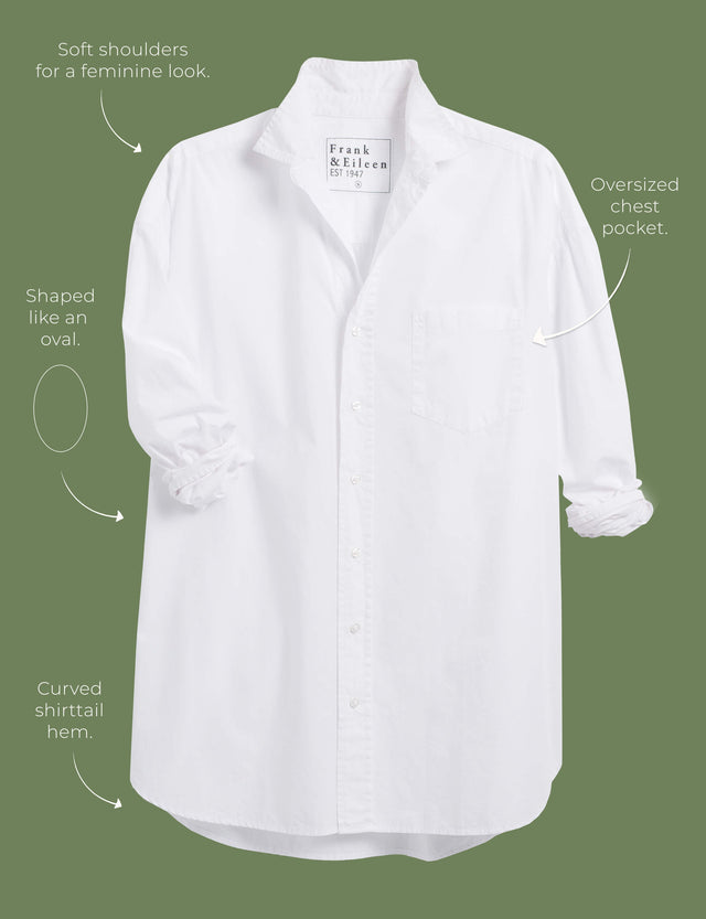 Meet the Shirley Oversized Shirt from Frank and Eileen, designed with a curved shirttail hem that’s long enough to cover your bum. Shaped like an oval with soft shoulders, this piece brings a feminine touch to an oversized silhouette. Details include an oversized chest pocket, signature bust-flattering button placement, and long sleeves with button cuffs for a polished finish.