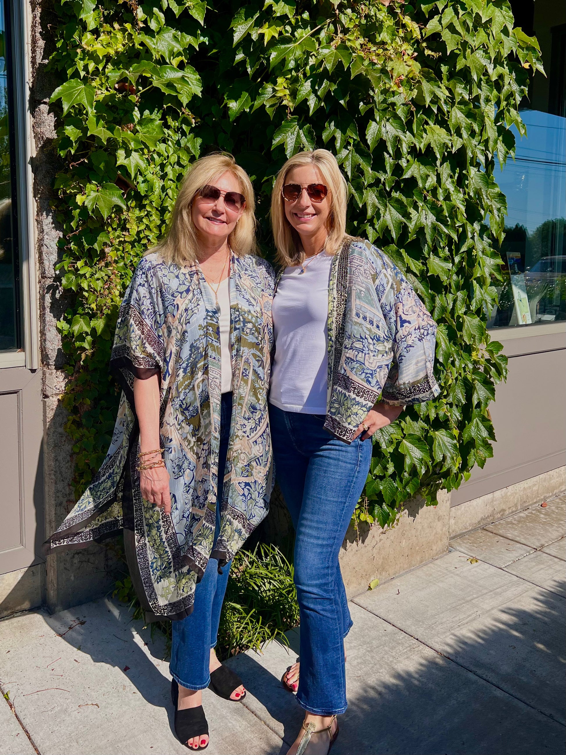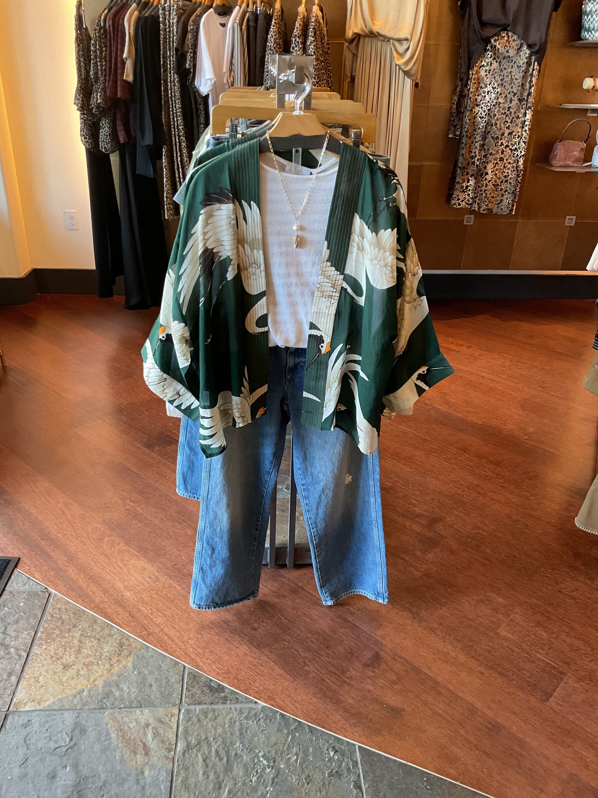 One Hundred Stars short kimono jacket in the Tapestry Sea print brings a silk-like drape to any outfit. The waist-length cut features wide ¾-length sleeves and an open-front slip-on design perfect over a neutral cami or little black dress