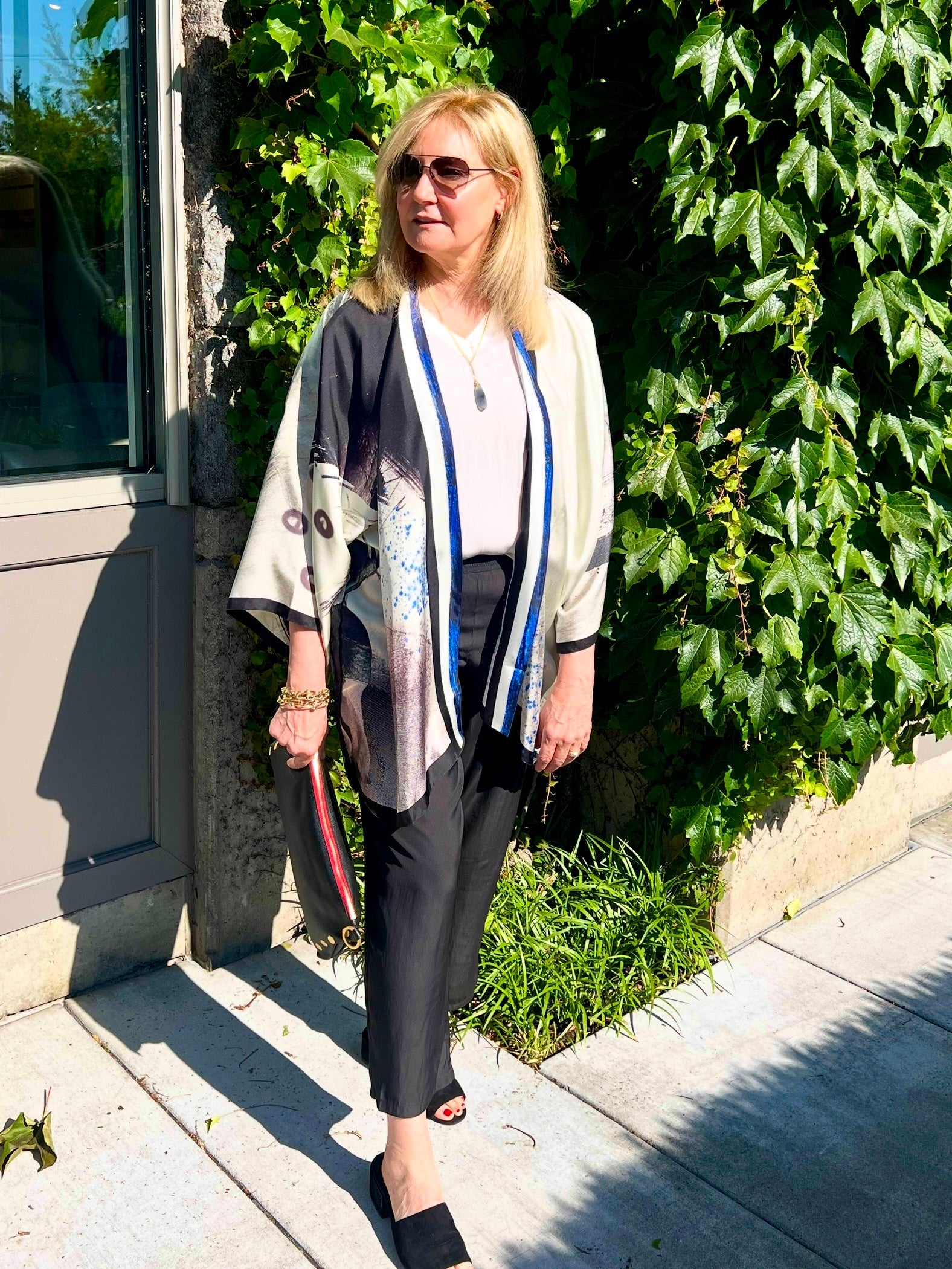 The Kimono by Isabelle Gougenheim is crafted from 100 % silk for a soft luxurious feel. Its one-size-fits-all design drapes elegantly whether worn as a robe jacket or shirt