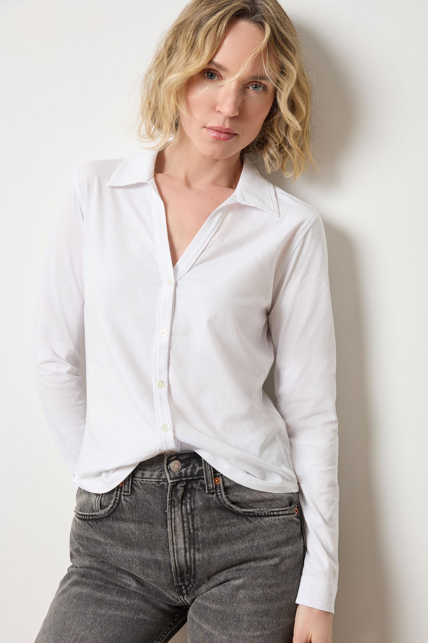 A fresh update to the classic button down. The split collar detail gives this shirt a modern edge while keeping its timeless appeal. Perfect tucked, untucked, or layered.