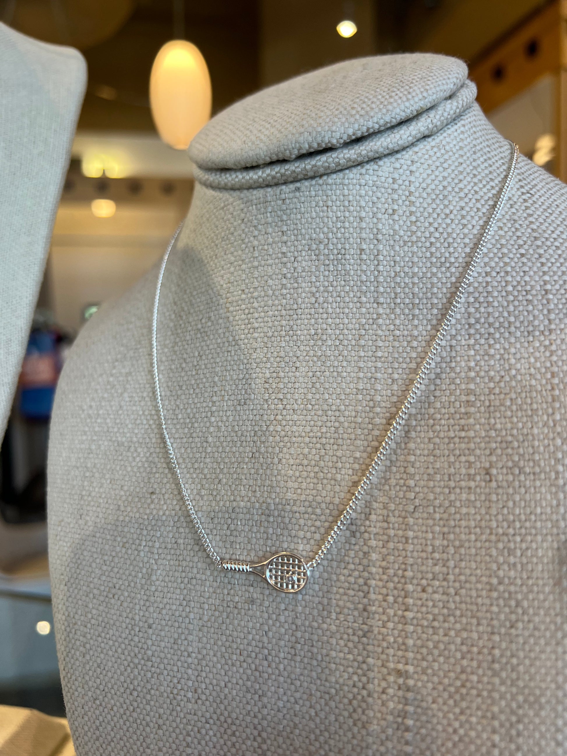 A sculpted golden racquet hitting a sparkling gemstone tennis ball, held by a delicate curb chain.