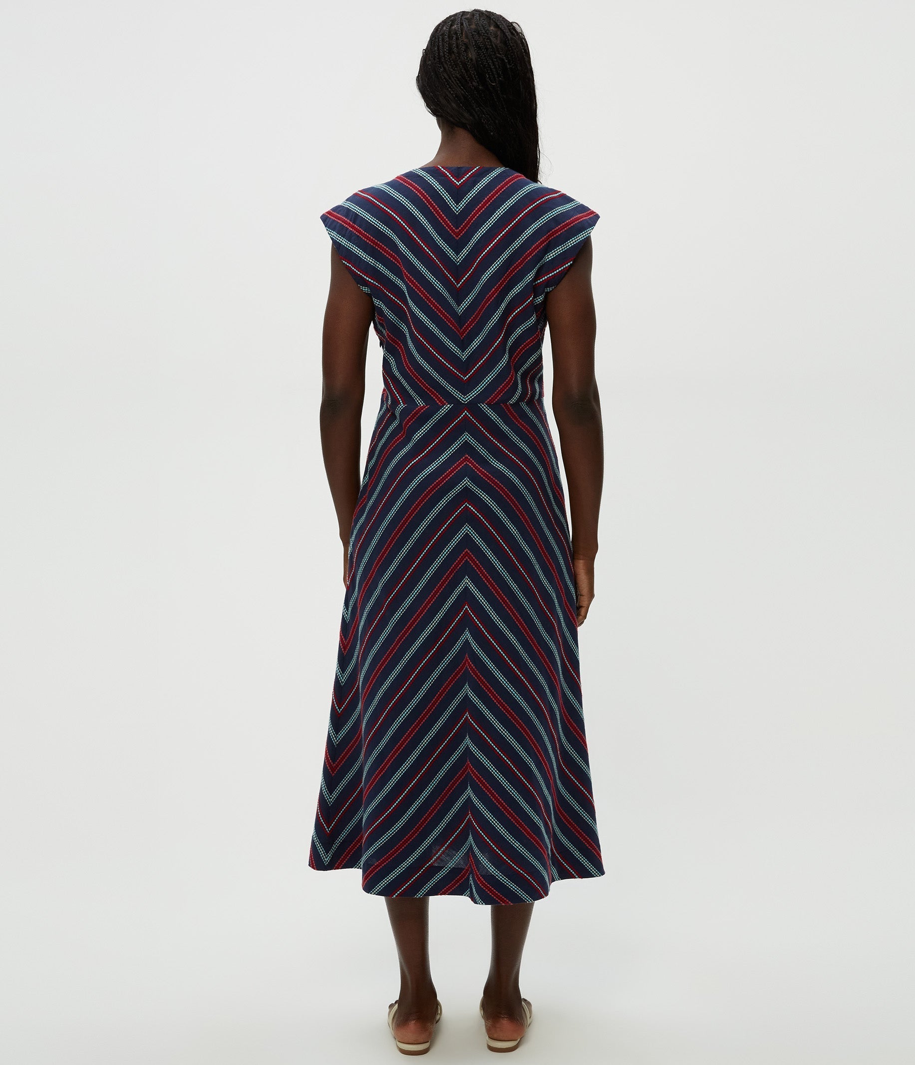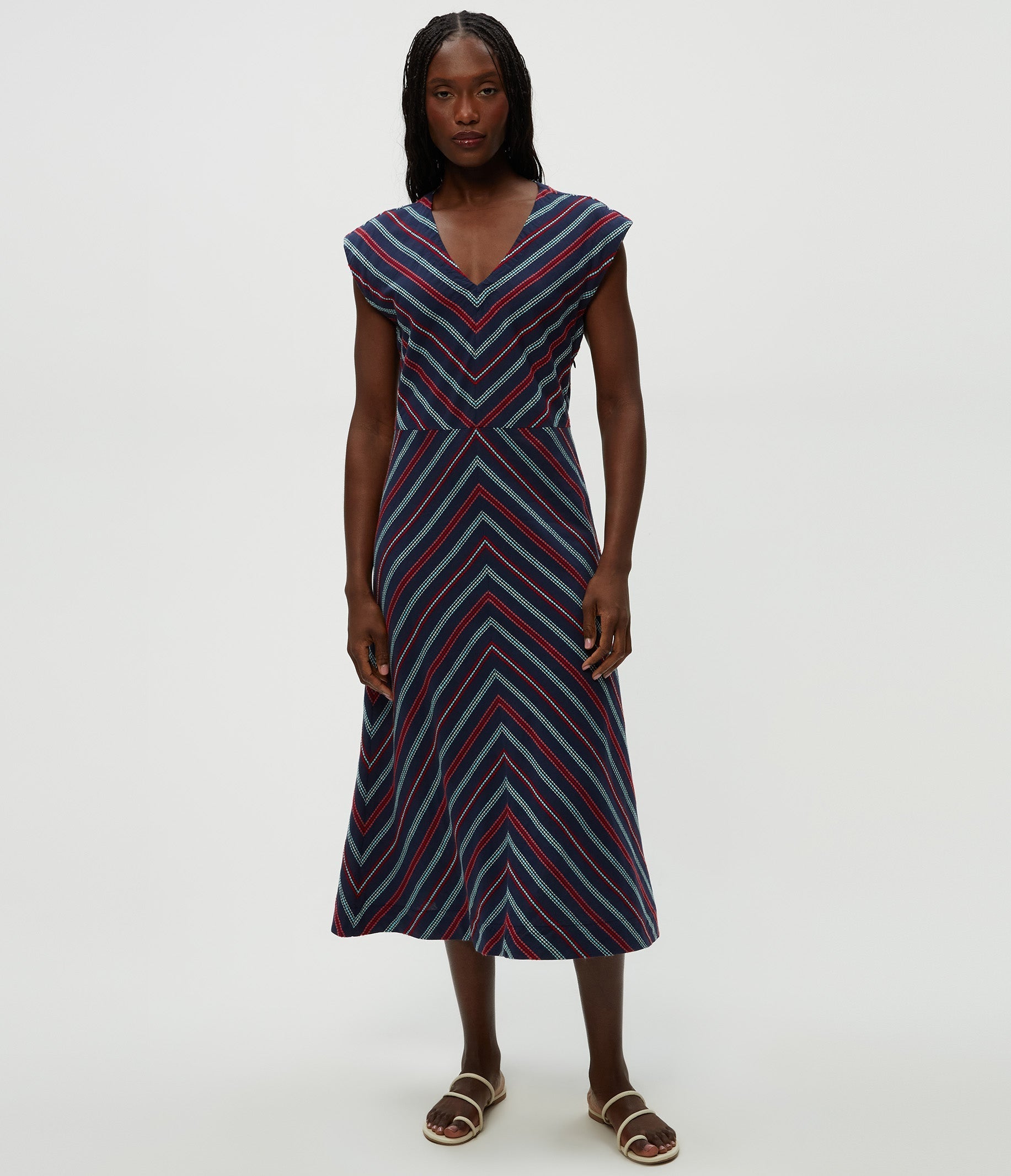 The Tess Midi is crafted in 100 % cotton with an embroidered stripe for subtle texture. Its fitted bodice and flared hem create a flattering silhouette. The v-neckline and cap sleeves make it equally suited to dinner dates or casual outings with sneakers