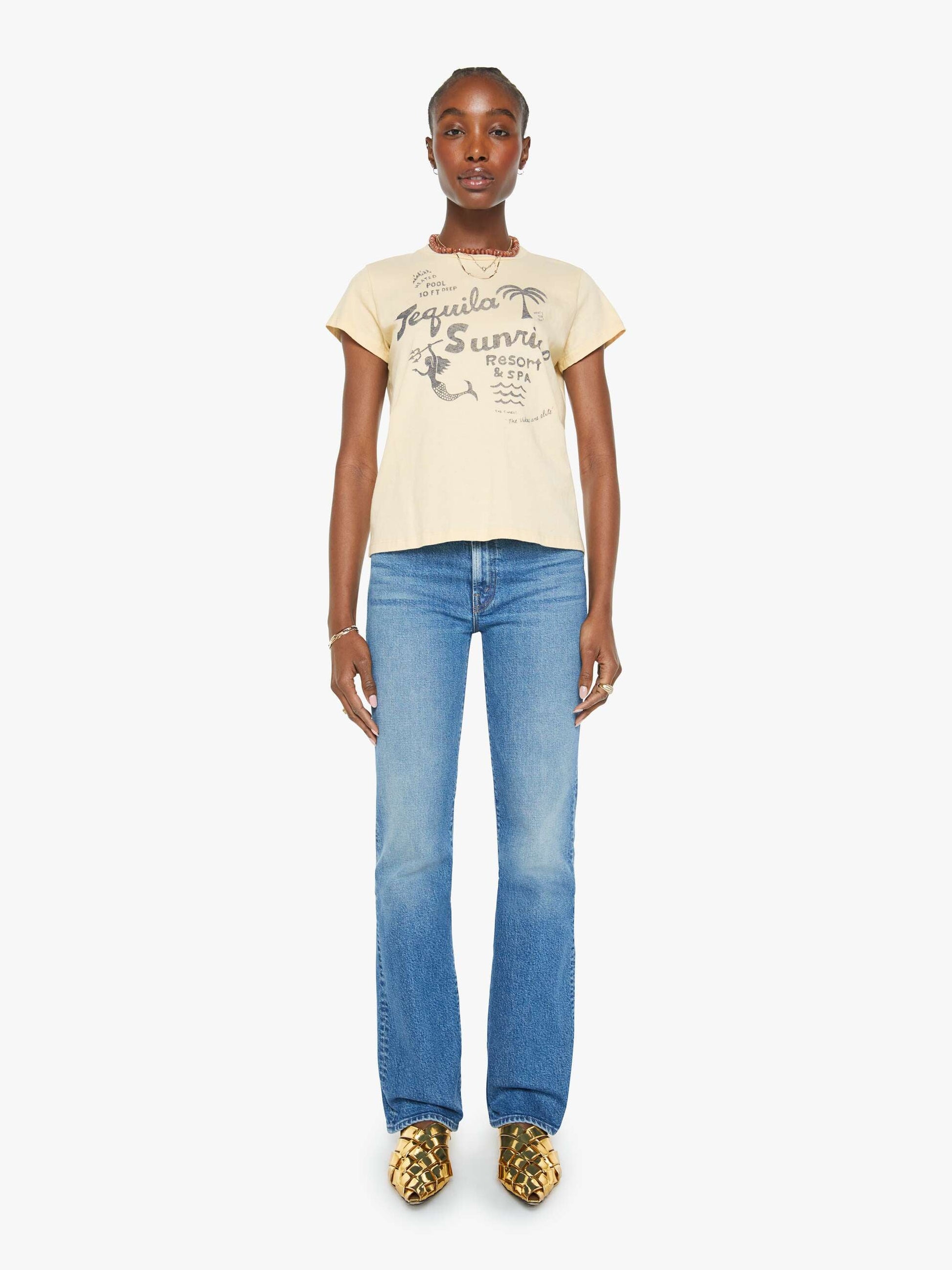 A soft crewneck tee crafted for a slim, vintage-inspired fit in pale peach. The front features a faded black graphic of a mermaid, palm tree, and text. The back showcases the same graphic in orange, evoking a classic resort vibe.